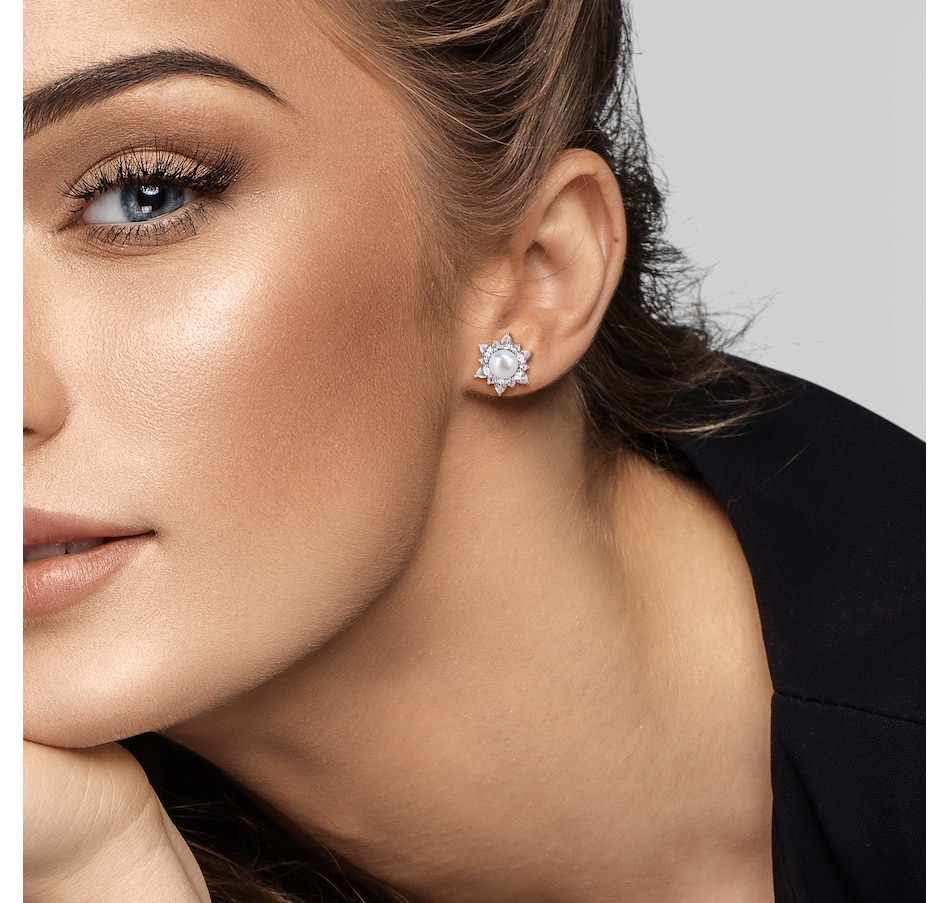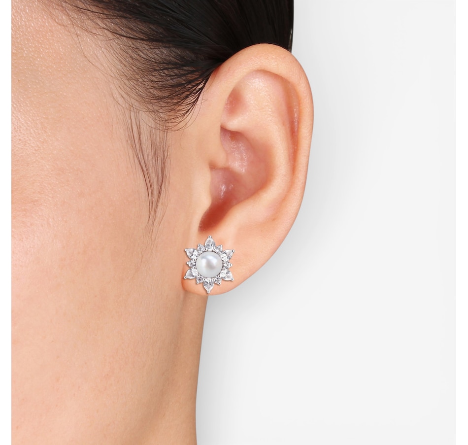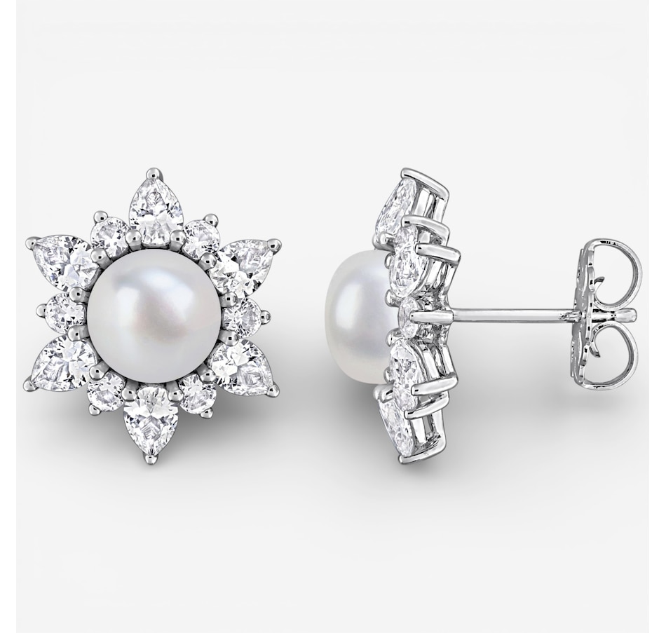 These earrings showcase the refined beauty of round cultured freshwater pearls paired with the elegant sparkle of created white sapphires. The combination of pear and round stones brings graceful brilliance to the design, creating a look that is both radiant and timeless. Their polished finish and classic drop make them a sophisticated addition to any jewellery collection.