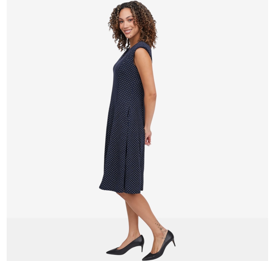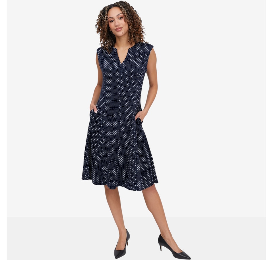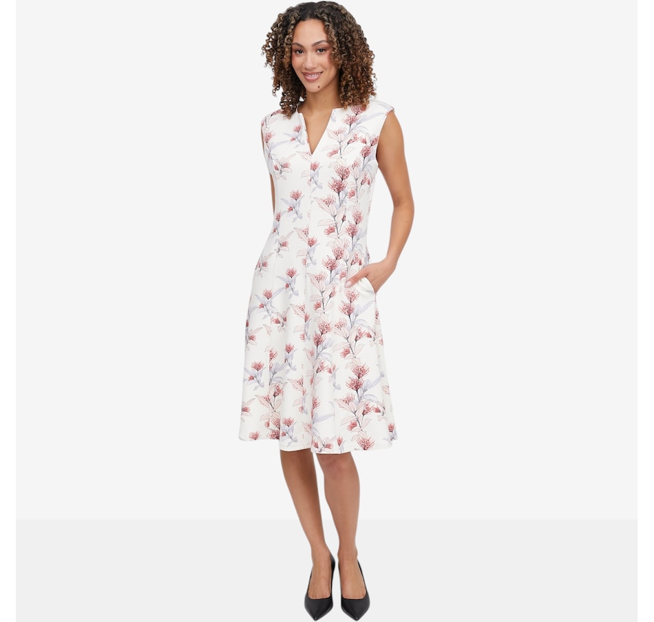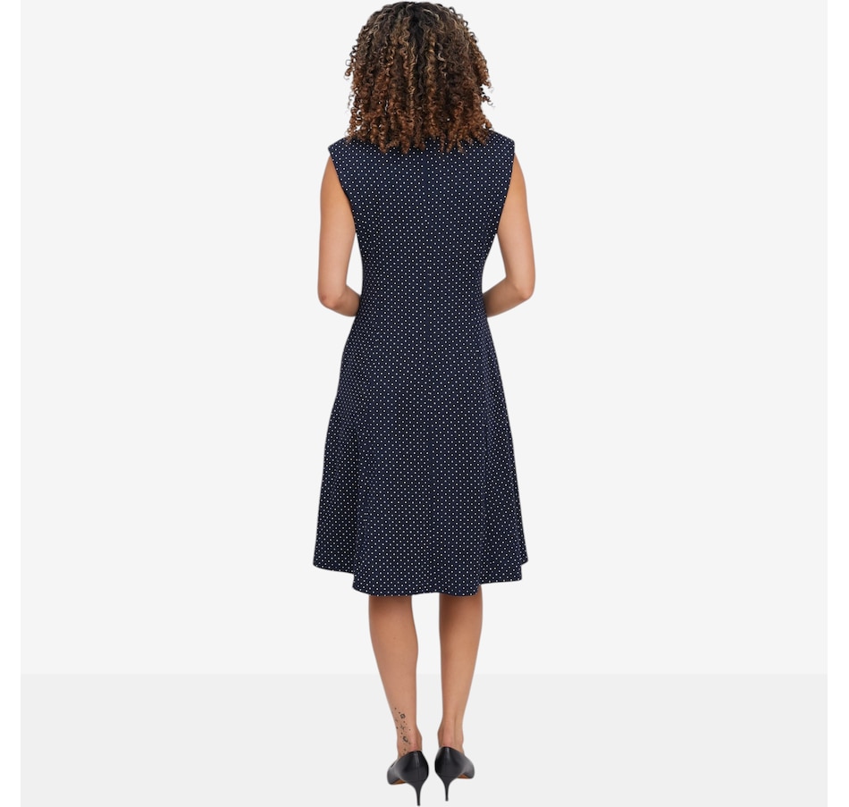 The Yael printed scuba fit and flare dress from Badgley Mischka is a striking blend of modern structure and feminine ease. Crafted in the brand’s signature double‑knit modal fabric, this sleeveless dress offers a sculptural yet comfortable feel that skims the body and highlights the flattering fit‑and‑flare silhouette. The split V‑neckline creates a beautiful frame for your favorite jewellery or scarves, while subtle shoulder pads add a bold, triangular shape that elevates the look with fashion‑forward edge. Fully lined with a soft, washable tricot lining and finished with practical pockets, the Yael combines thoughtful design with effortless wearability.
