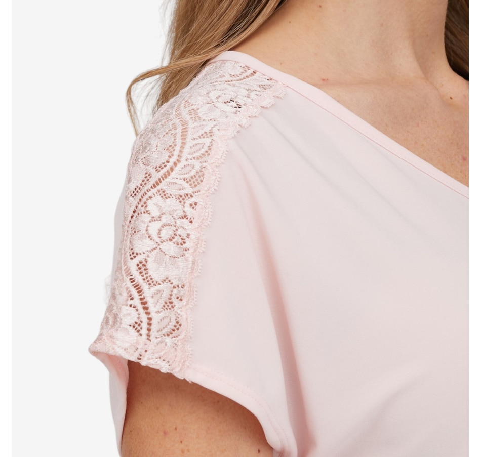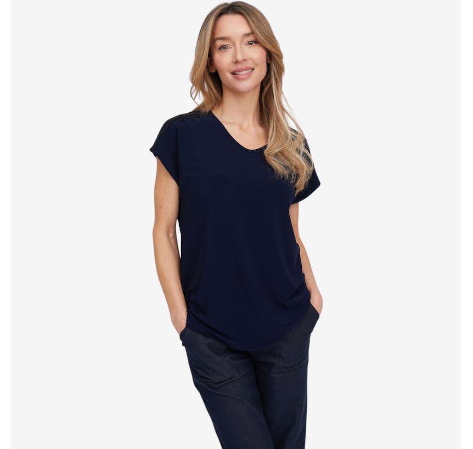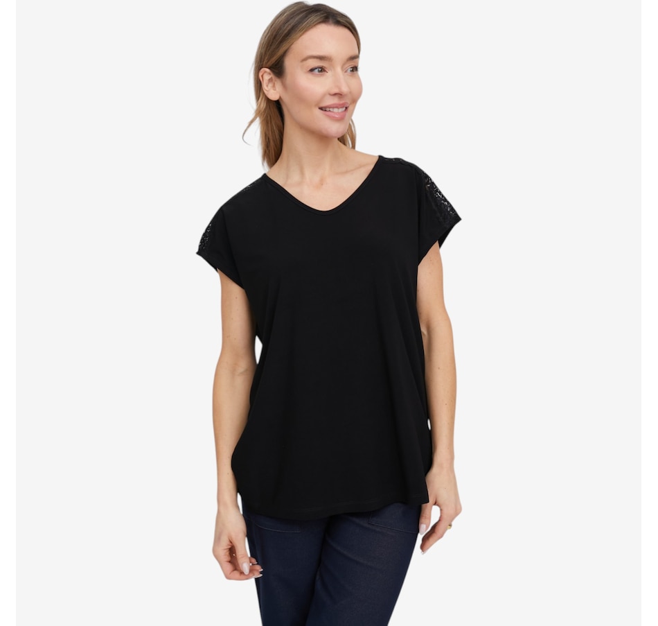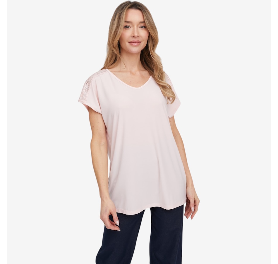 Bring a touch of delicate elegance to your everyday style with this deluxe Brazil knit lace detail short sleeve top from Kim & Co., a beautifully refined piece that blends softness with subtle statement details. Crafted in the brand’s signature silky‑smooth Brazil knit, this dainty top features a soft v‑neckline and short dolman sleeves that drape gracefully for a flattering, effortless silhouette. Along the shoulders, a scalloped lace insert running from neckline to the sleeve's edge adds a feminine touch, while the double‑needle stitched hem makes for a clean, polished finish.