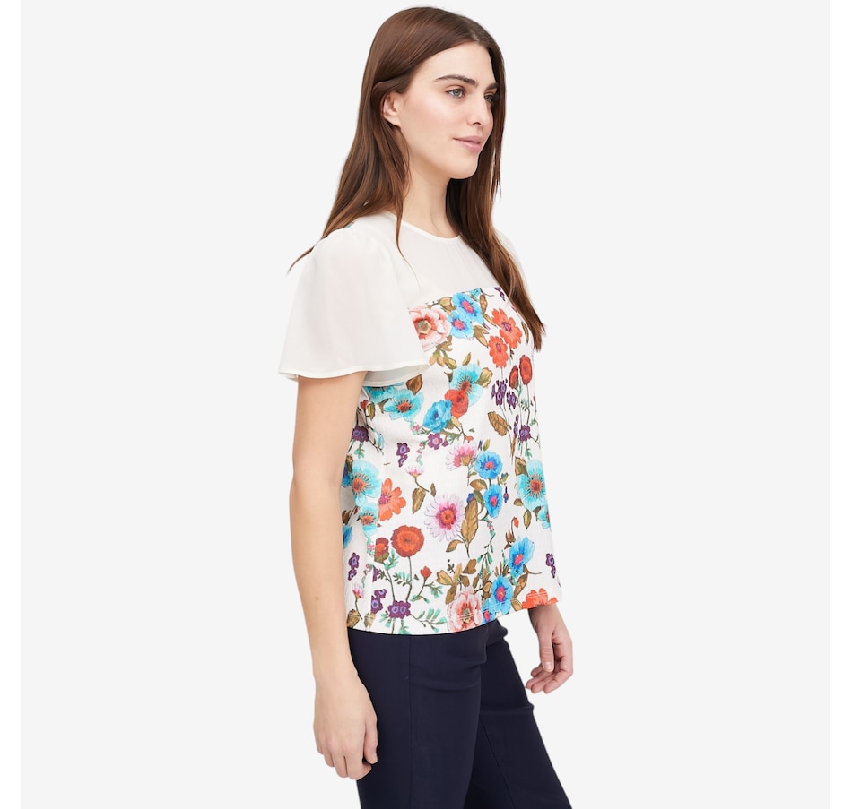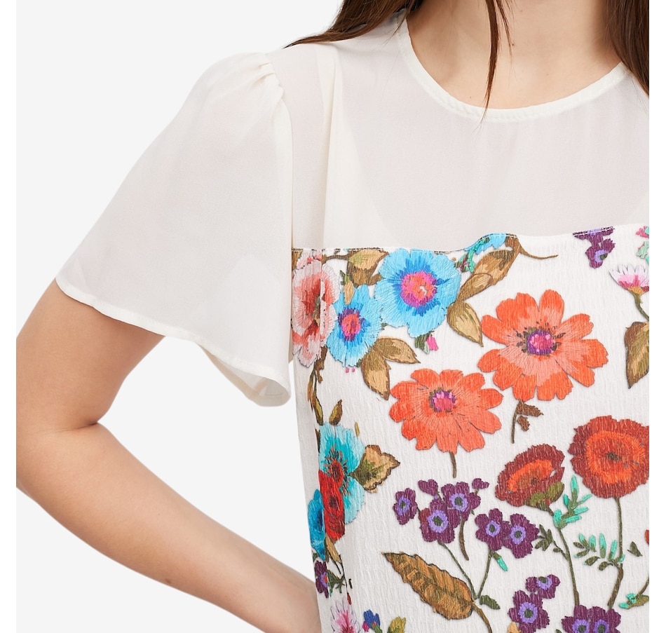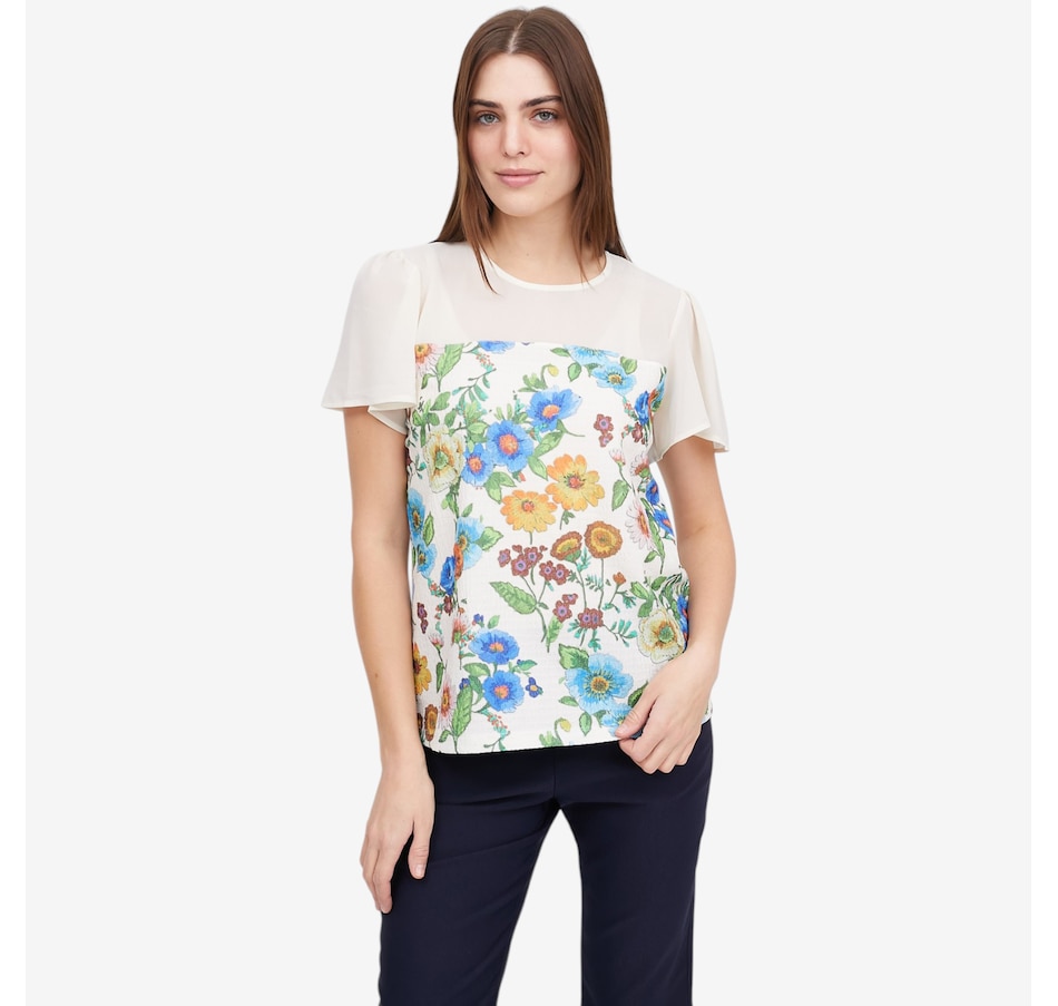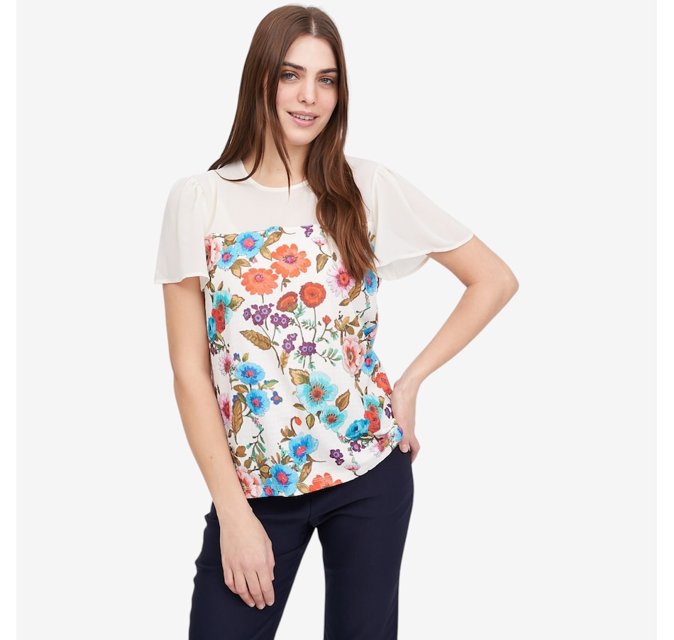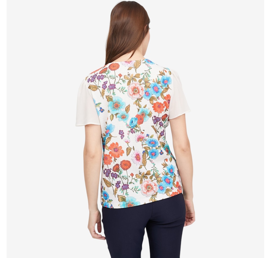 Add a touch of artistic elegance to your wardrobe with this crinkle knit print top from Mr. Max, a beautifully detailed piece that blends vibrant colour with soft, graceful movement. The colourful floral print brings lively personality, while the crinkle knit body offers comfort, stretch, and a flattering textured finish. The semi‑sheer chiffon yoke adds a light, feminine touch, complemented by flowing chiffon bell sleeves that drape with effortless elegance. A classic round neckline and short sleeves complete the look, with great stretch and recovery making for lasting comfort and shape.