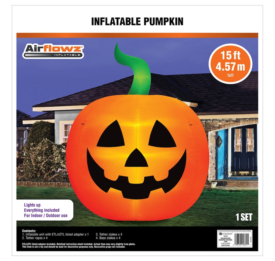 Elevate your Halloween decor with the Occasions Halloween fifteen foot inflatable pumpkin, a towering symbol of festive spirit. Setting up this colossal pumpkin is a breeze as it self-inflates in seconds, aided by the included blower, giving you more time to focus on crafting the perfect spooky atmosphere! Crafted to withstand the elements, its weather-resistant design allows for both indoor and outdoor use, while its illuminated form casts an enchanting glow. When the season comes to a close, deflate it with ease for convenient storage.