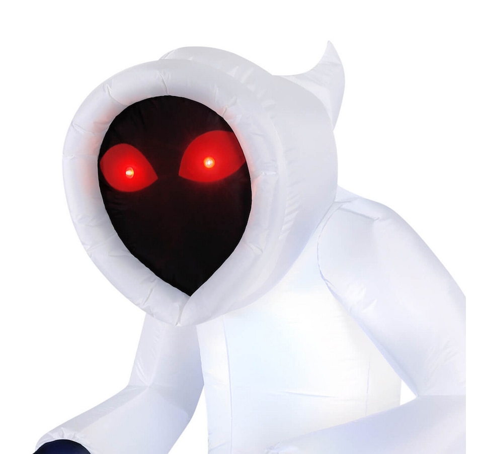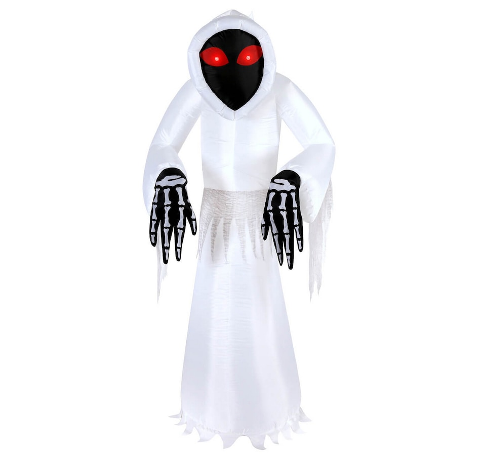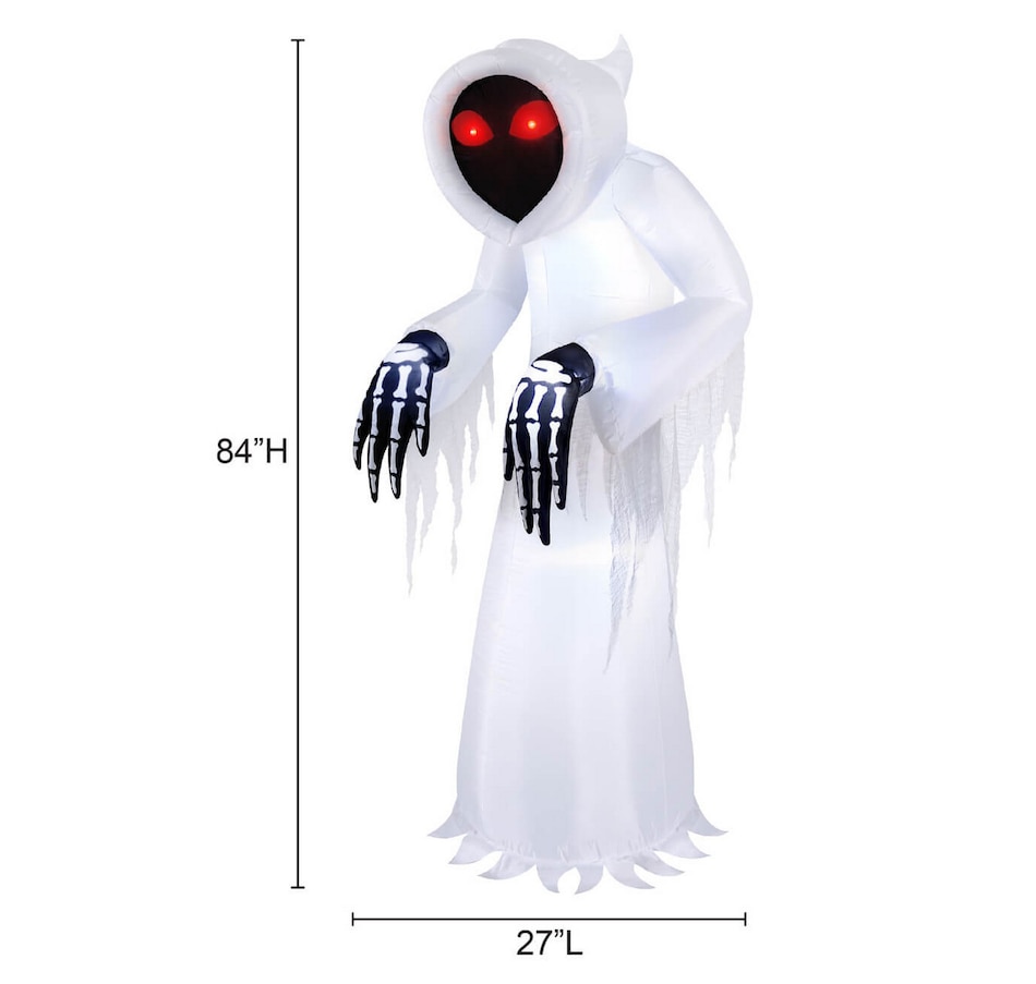 Introducing the Occasions Halloween seven foot inflatable faceless reaper, a spine-chilling addition to your Halloween décor that self-inflates in seconds with the included blower. Designed for both indoor and outdoor use, this weather-resistant reaper features eerie internal lights that create a haunting glow, perfect for spooking trick-or-treaters and guests alike! When Halloween is over, it easily deflates for convenient storage until next year. Transform your space with this towering, faceless reaper and make your Halloween celebration truly unforgettable!