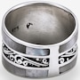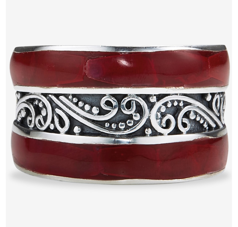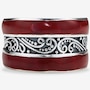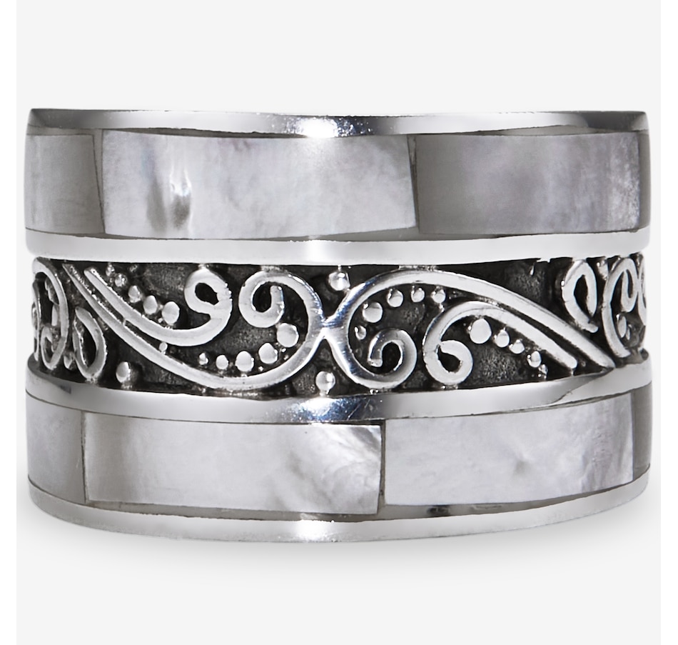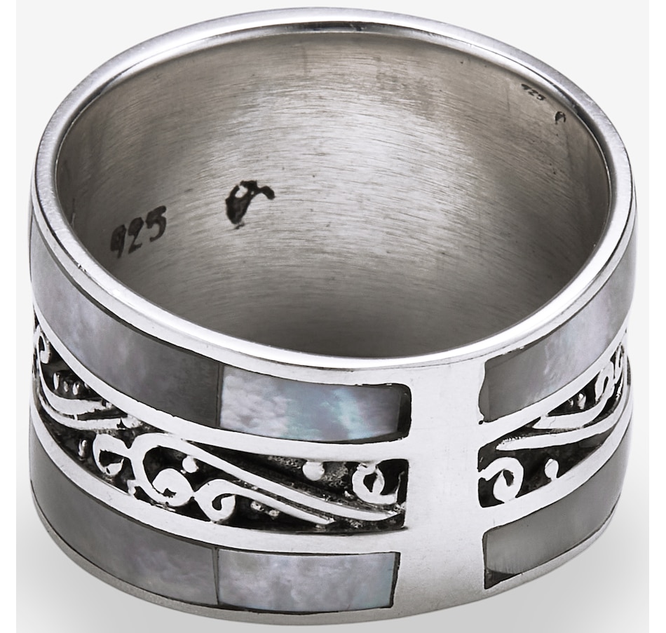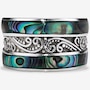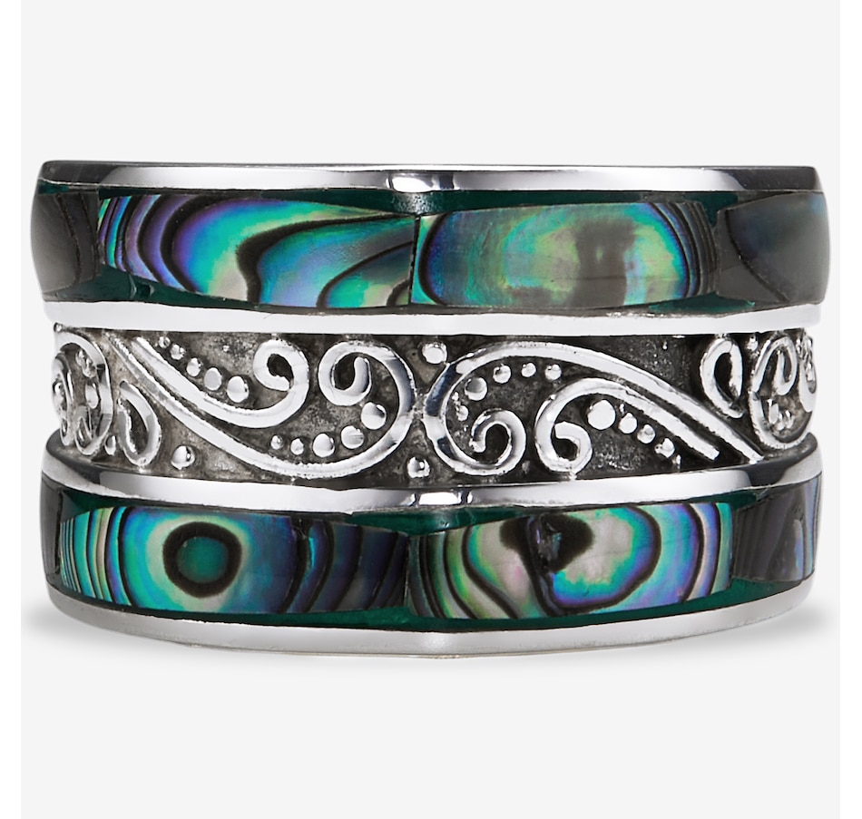 This ring features intricate scrollwork details that add depth and artistry to the design. The inlay accents bring rich natural colour and texture, creating a striking contrast against the smooth silverwork. With its bold presence and comfortable fit, the piece offers a refined expression of handcrafted style.