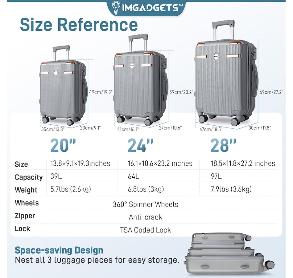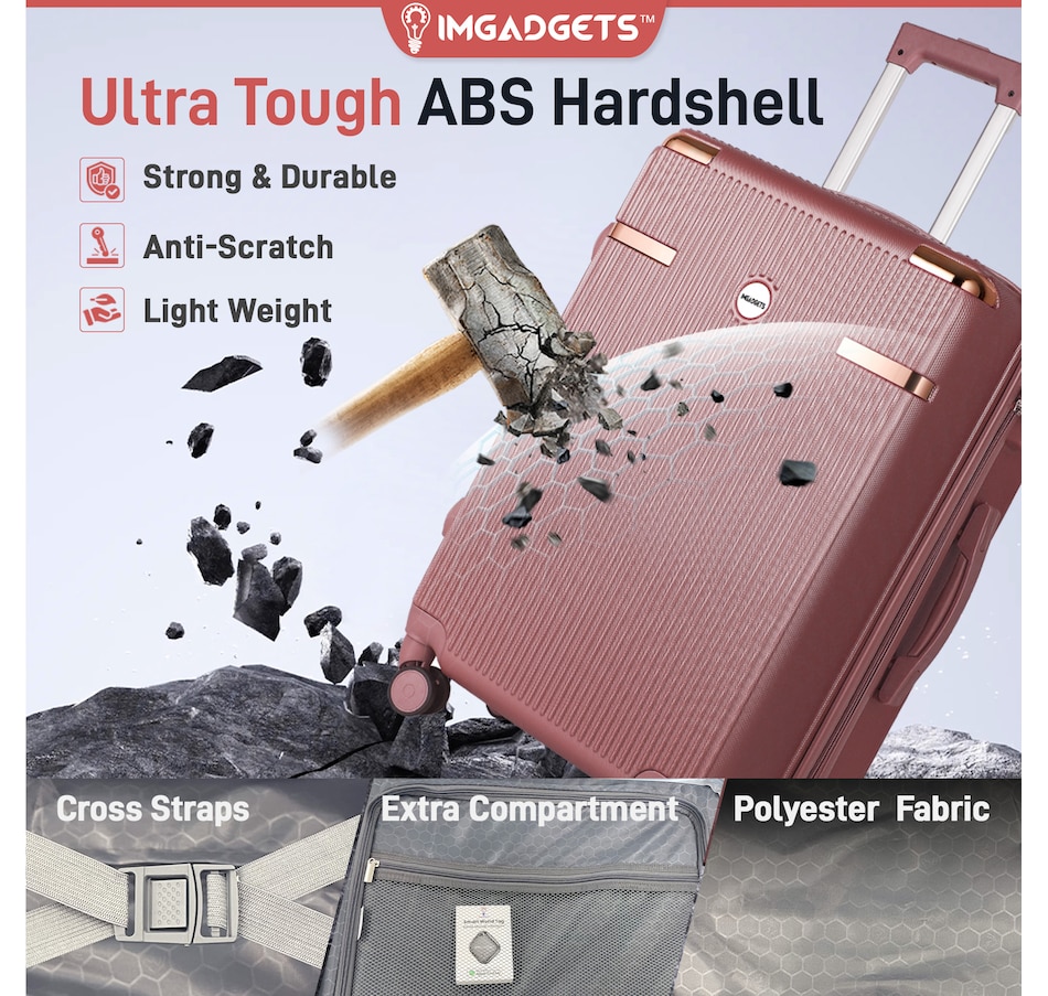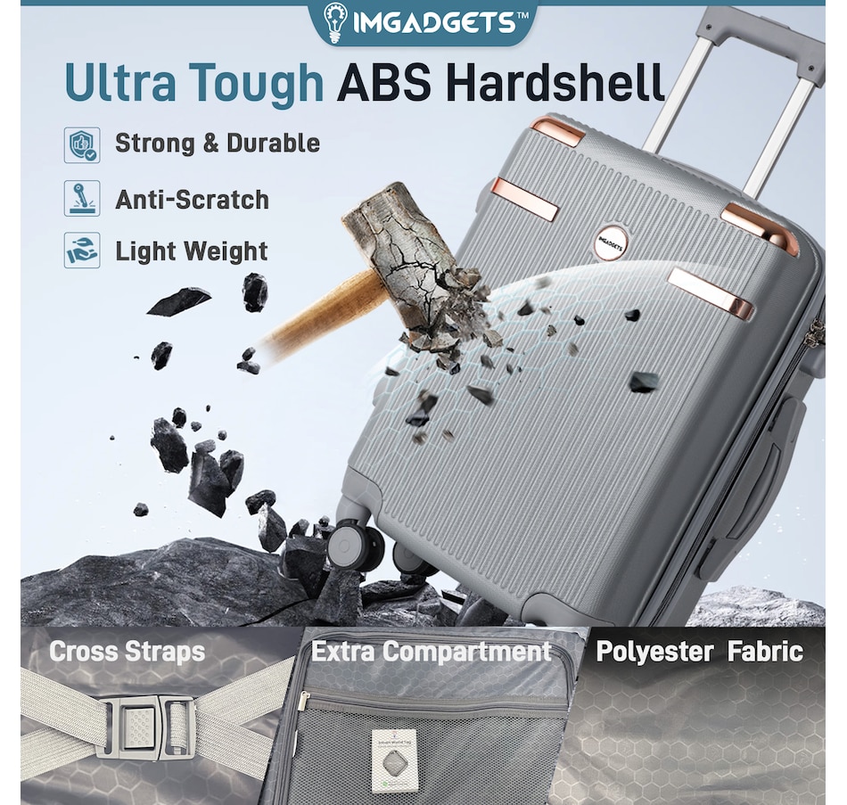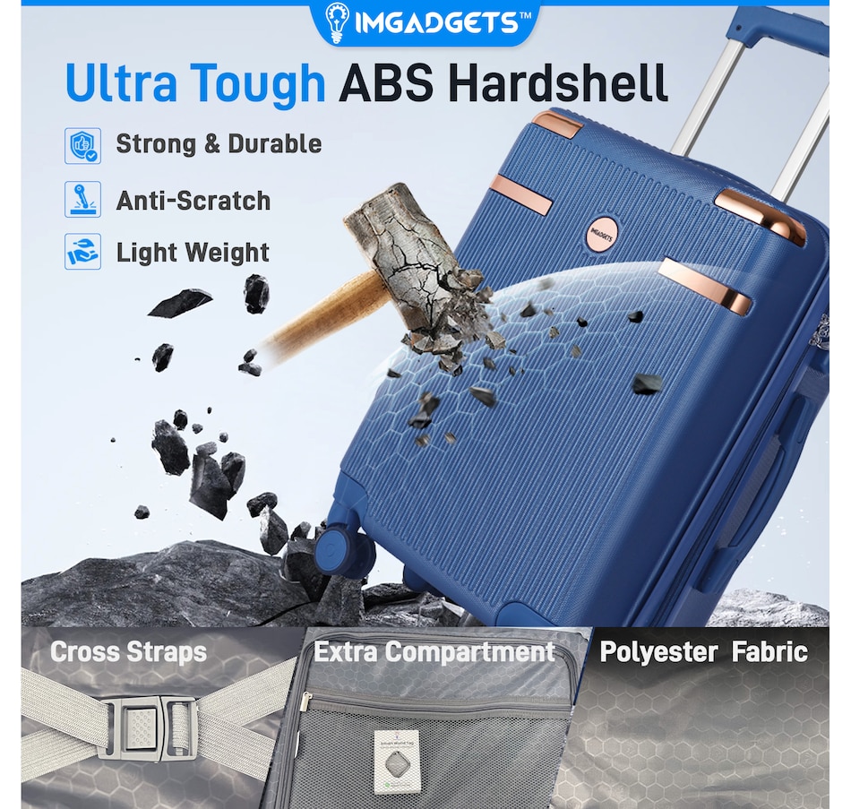 Premium Luggage Set for Every Journey: The IMGadgets Go 3PC Luggage Set includes a 20” carry-on luggage (39 L), a 24” medium suitcase (64 L), and a 28” large travelling bag (97 L). All pieces crafted with anti-crack ABS polycarbonate hard shells and reinforced zippers for long-lasting protection and performance.
