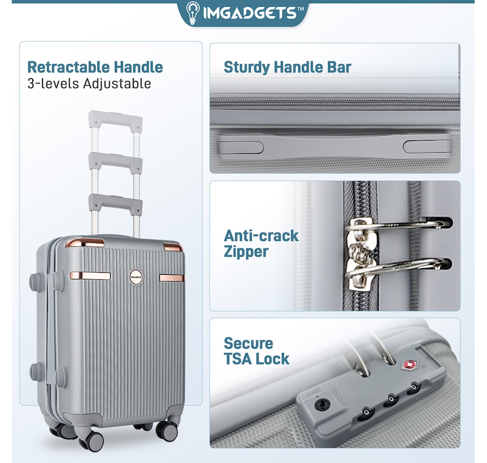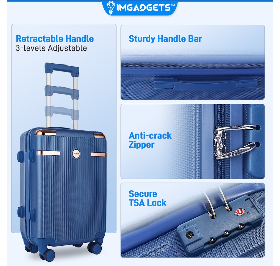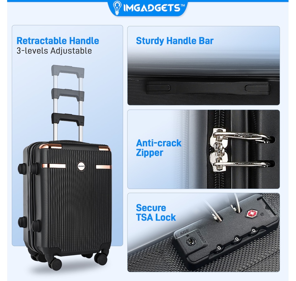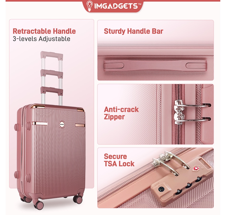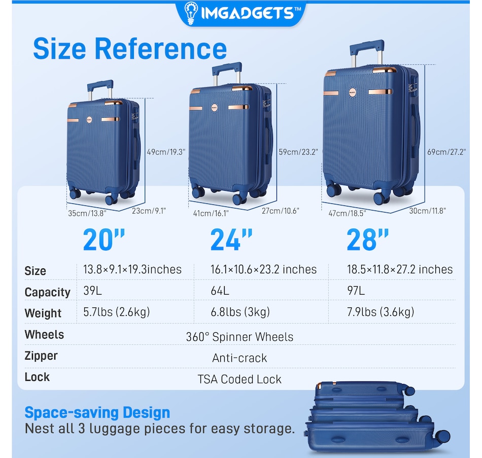 Premium Luggage Set for Every Journey: The IMGadgets Go 3PC Luggage Set includes a 20” carry-on luggage (39 L), a 24” medium suitcase (64 L), and a 28” large travelling bag (97 L). All pieces crafted with anti-crack ABS polycarbonate hard shells and reinforced zippers for long-lasting protection and performance.