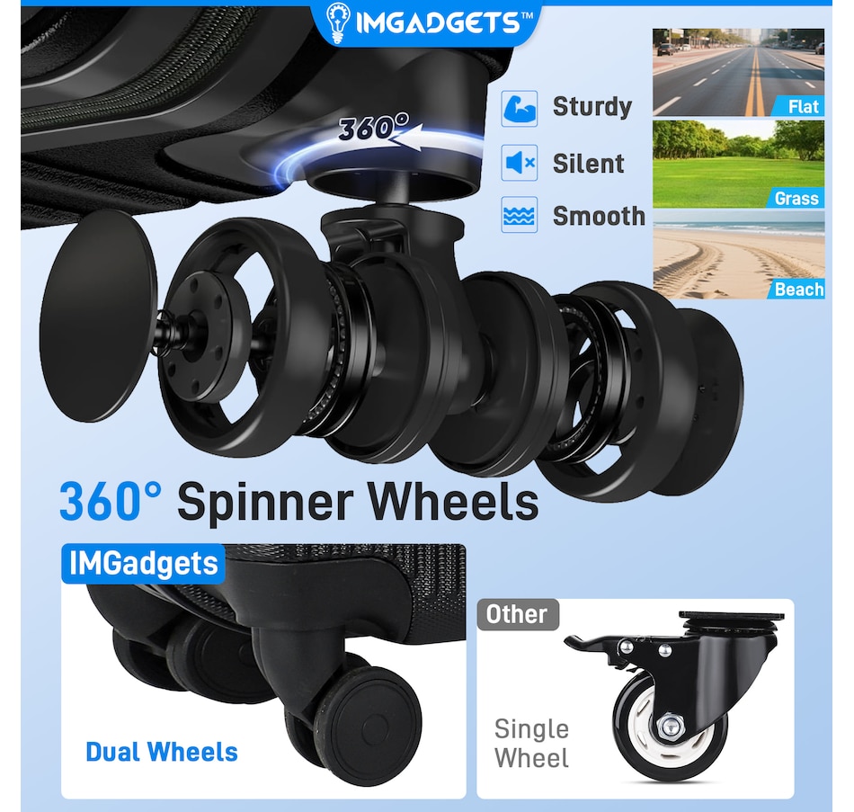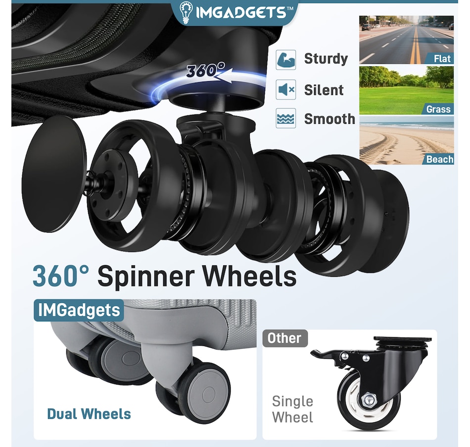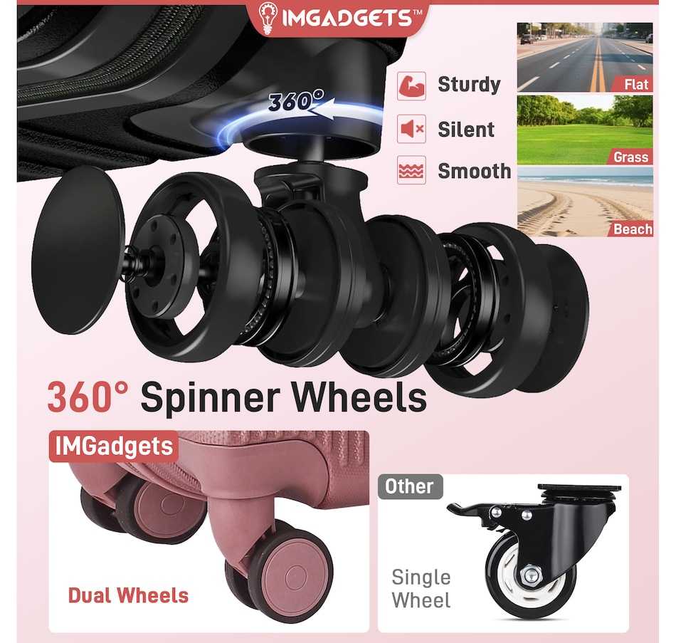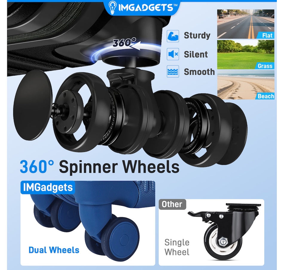 360° Spinner Wheels for Smooth Maneuverability: Navigate busy airports, train stations, and city streets with ease using multi-directional spinner wheels. Whether you’re pulling carry-on luggage or a full suitcase, enjoy easy, stable movement on any surface.