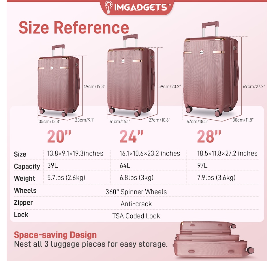 Lightweight and Spacious Design: The IMGadgets Go luggage offers maximum storage without extra weight, giving you enough space for clothes, shoes, electronics, and travel essentials. The 20" carry-on weighs just 5.7 lbs, the 24" medium suitcase comes in at 6.8 lbs, and the 28" large bag weighs only 7.9 lbs—light enough for smooth handling, yet durable enough for long-lasting use.
