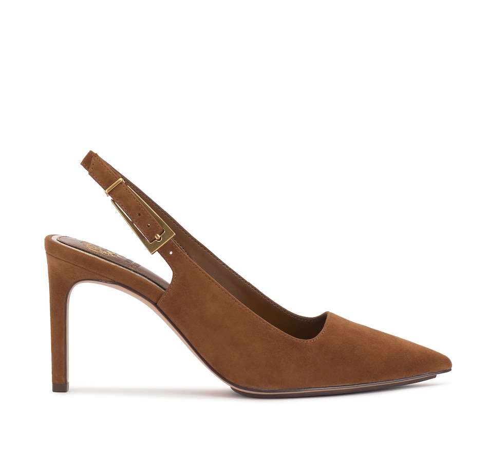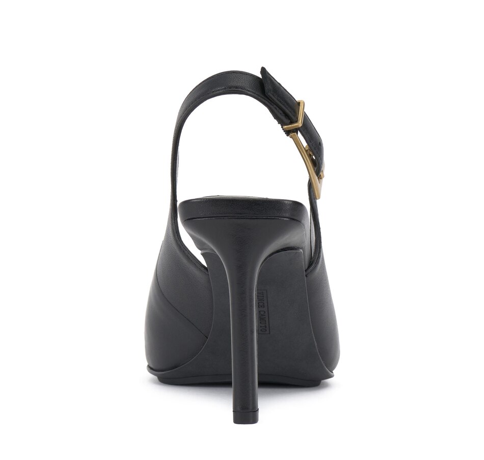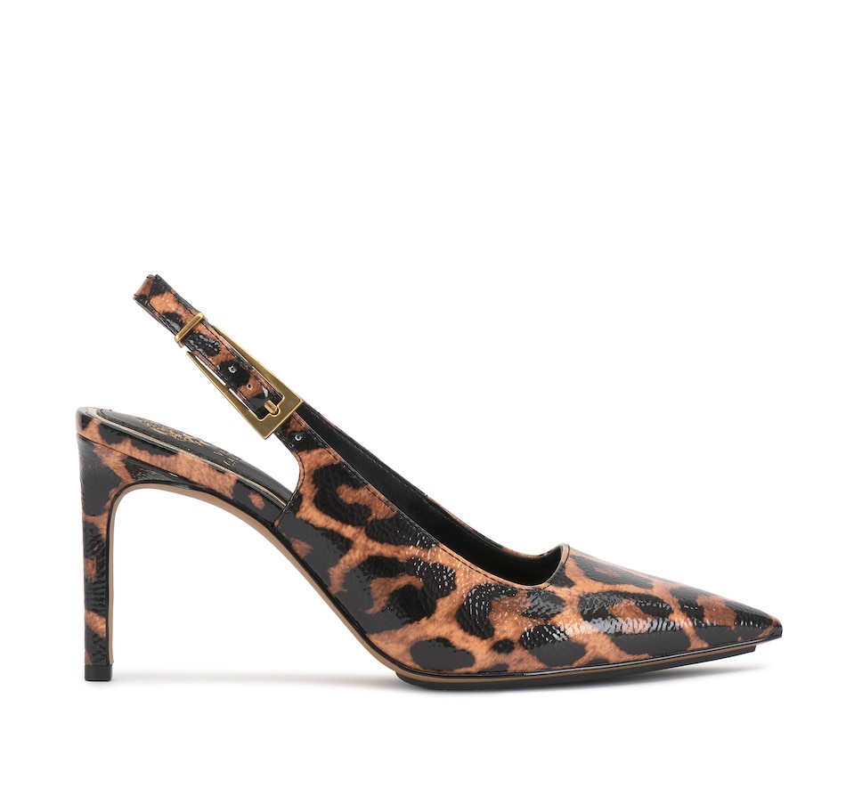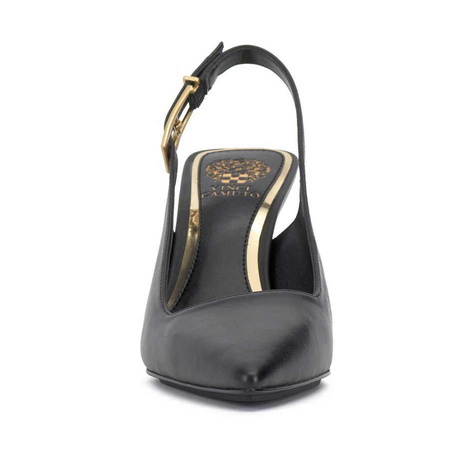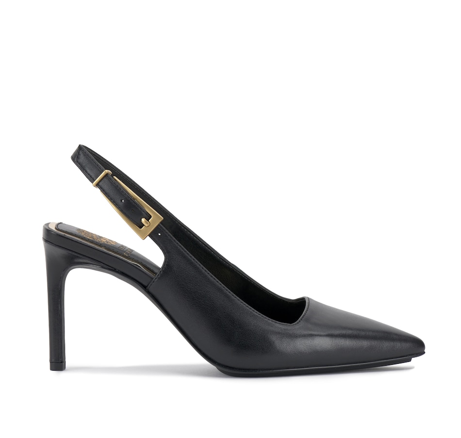 A rectangular buckle brings sculptural shine to this retro slingback pump from Vince Camuto. It is designed with a sharp pointy toe and softly squared topline.