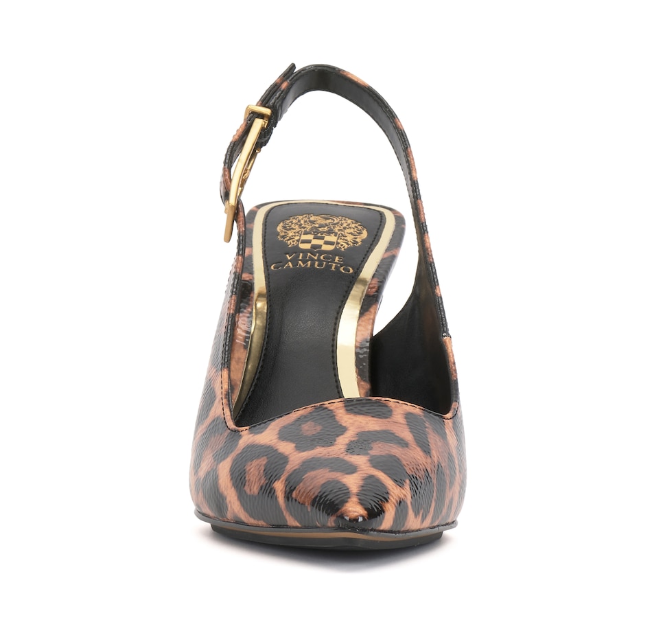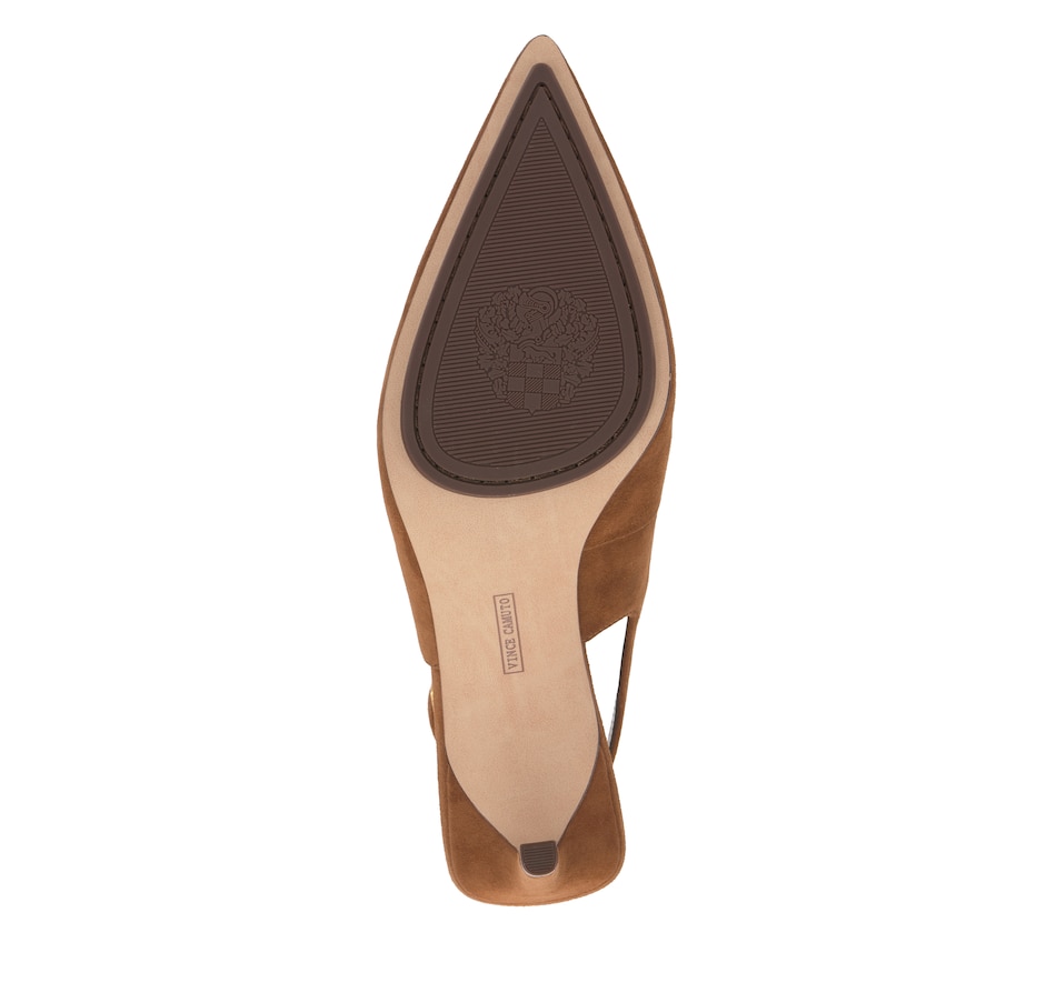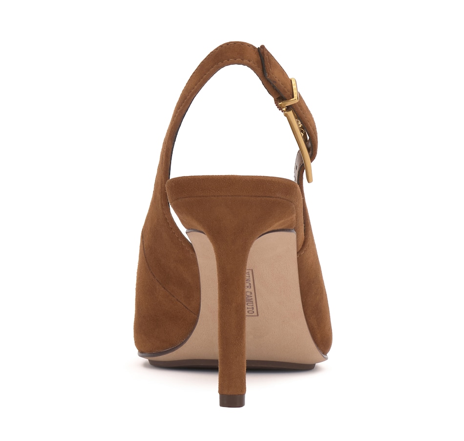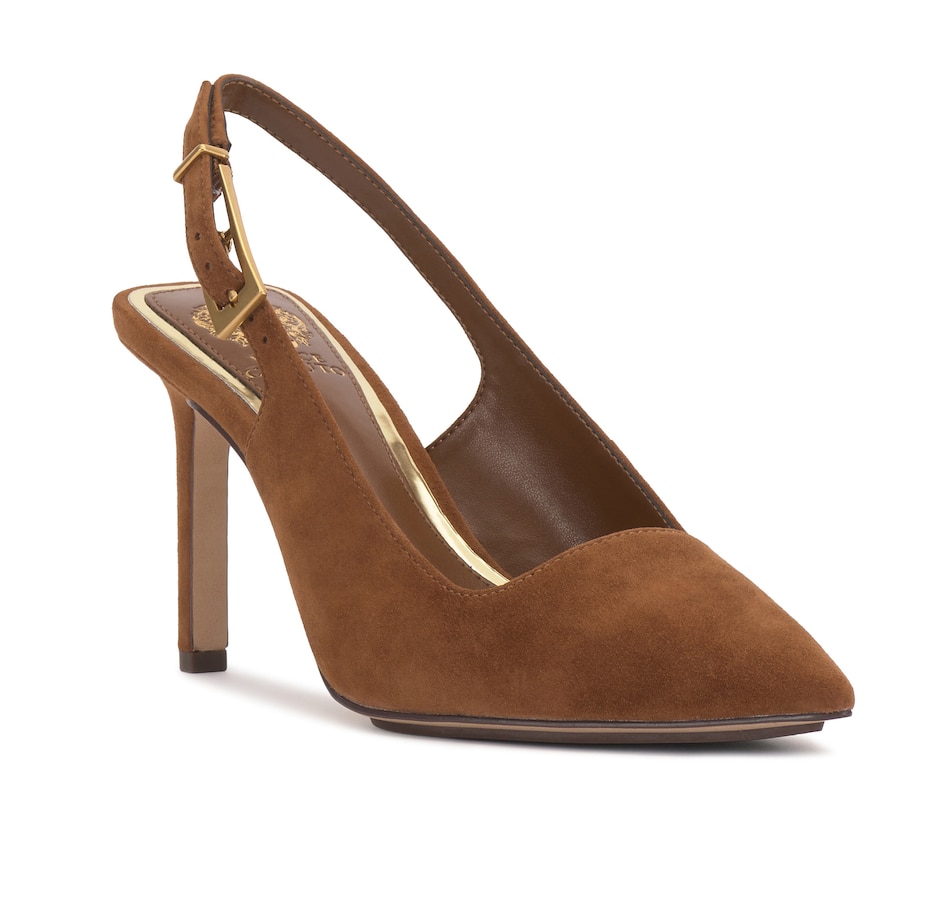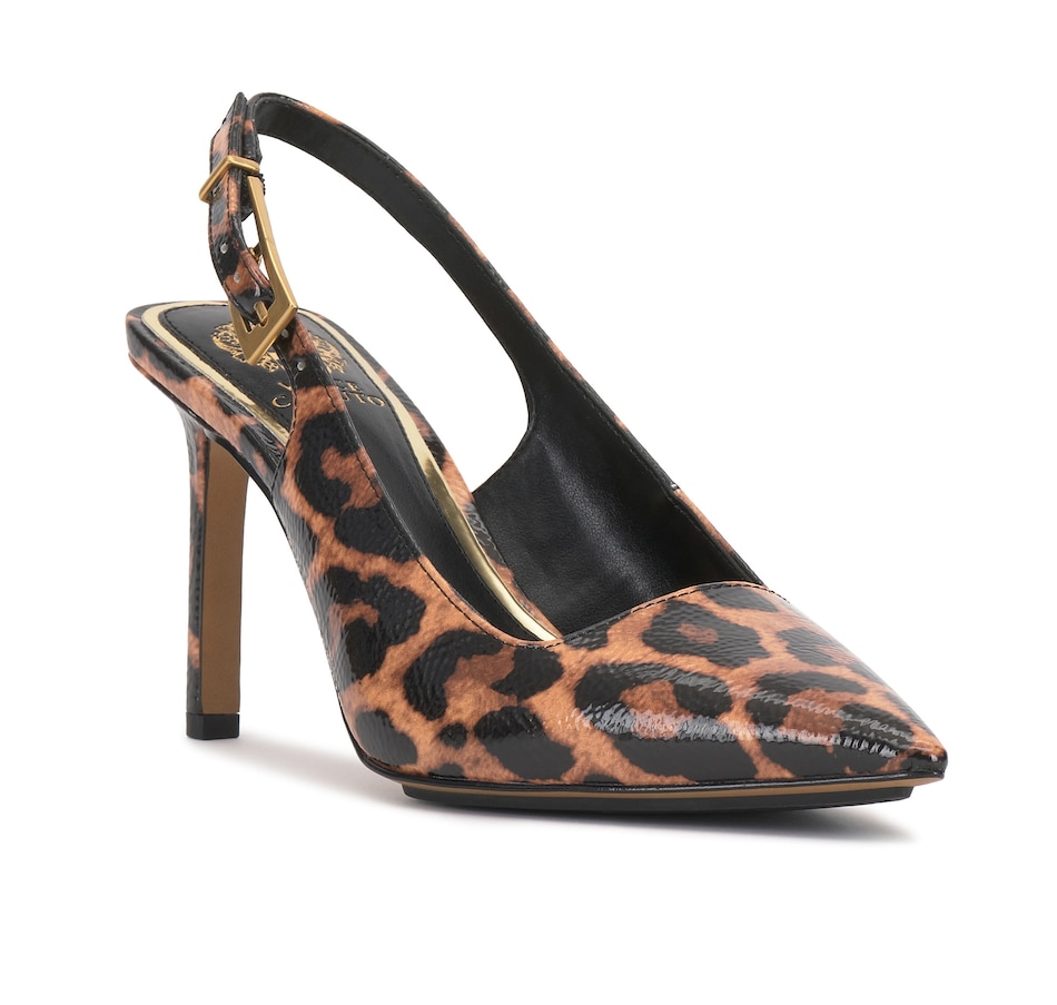 A rectangular buckle brings sculptural shine to this retro slingback pump from Vince Camuto. It is designed with a sharp pointy toe and softly squared topline.