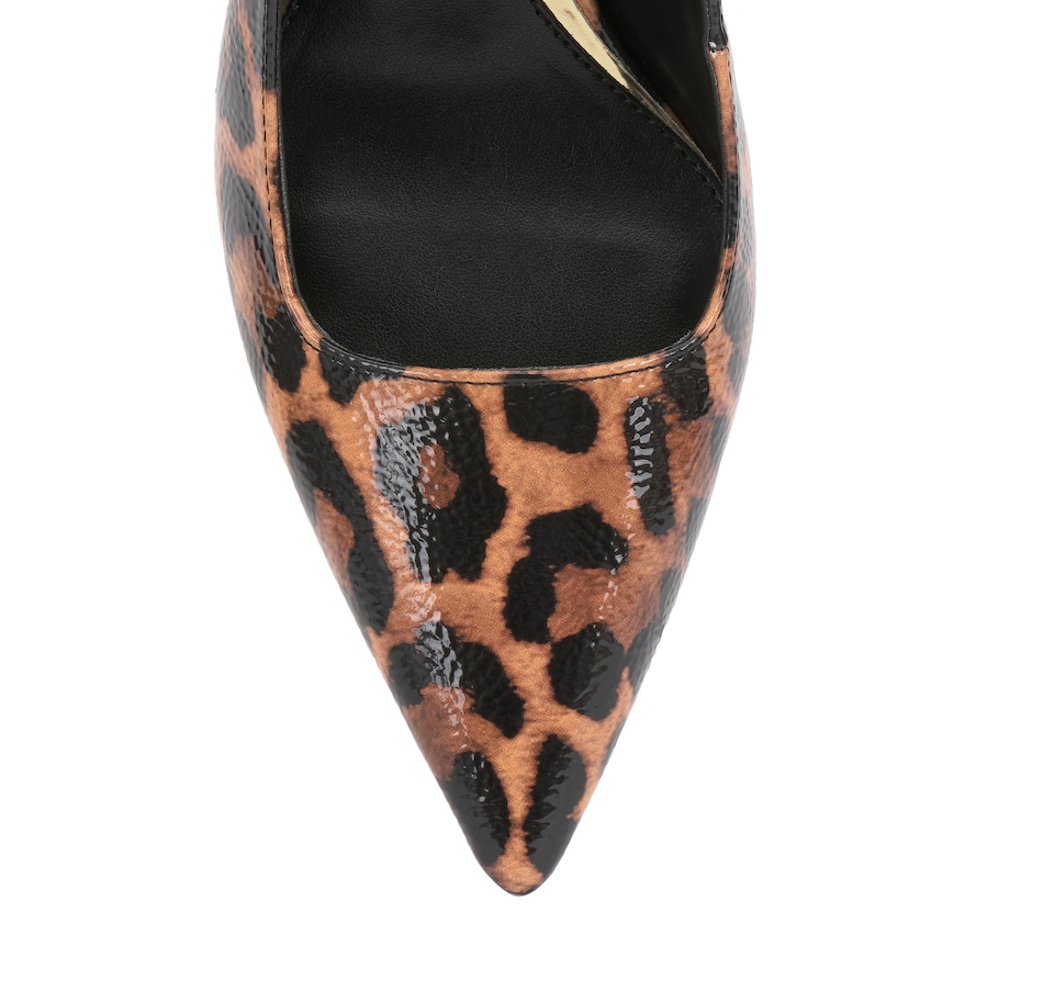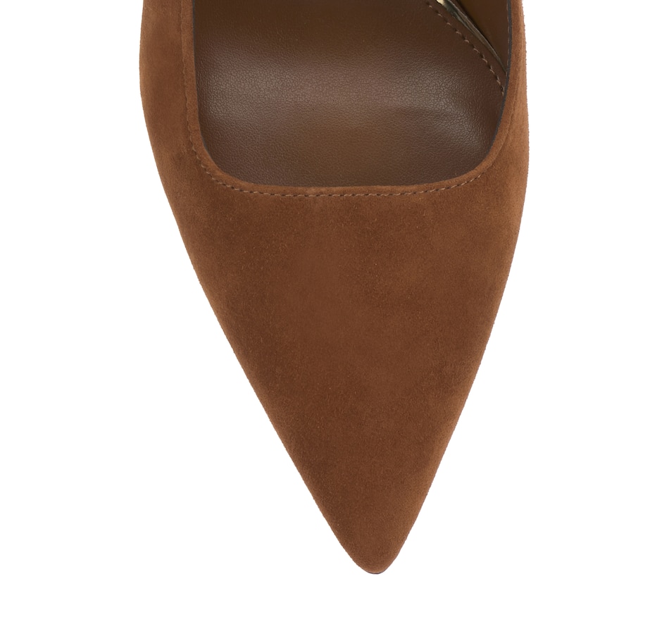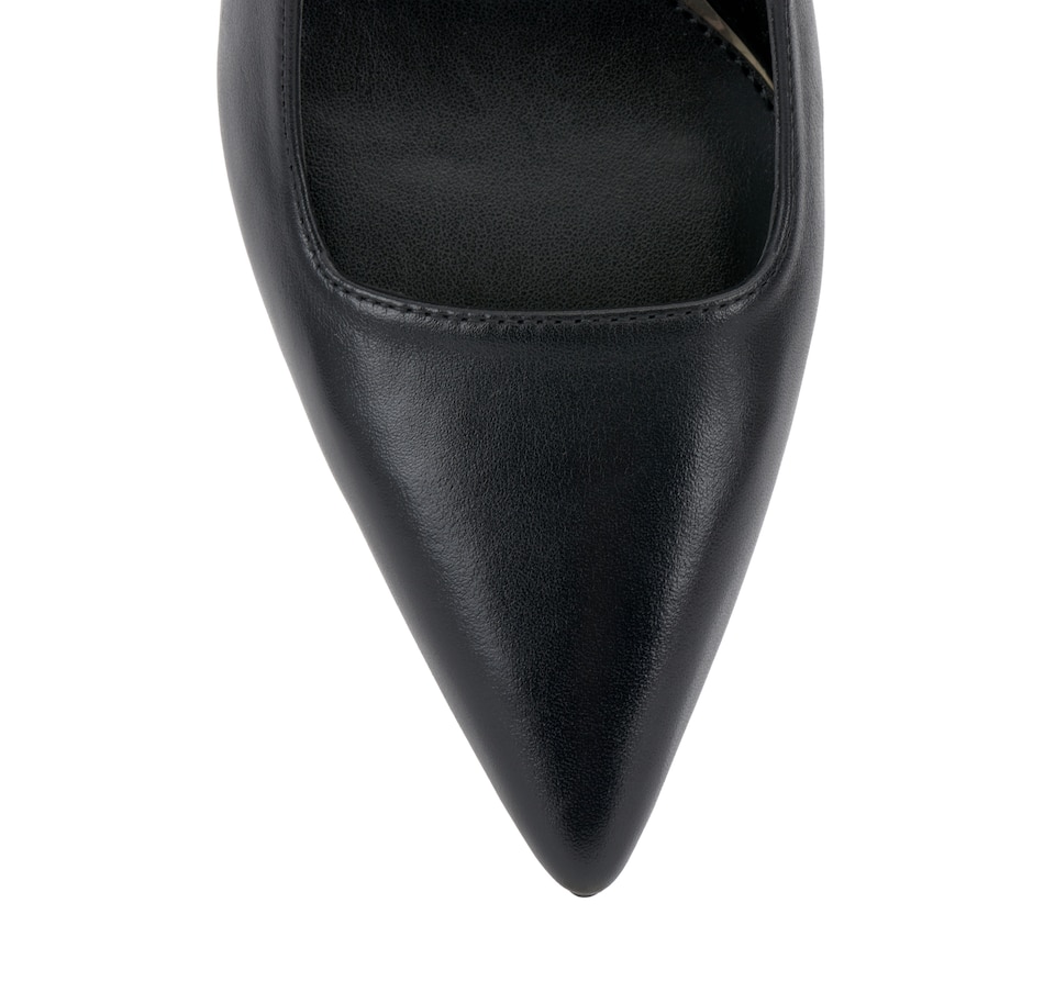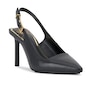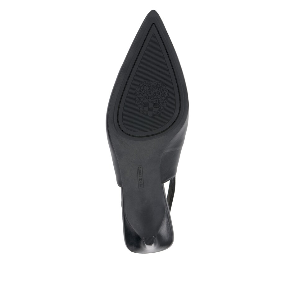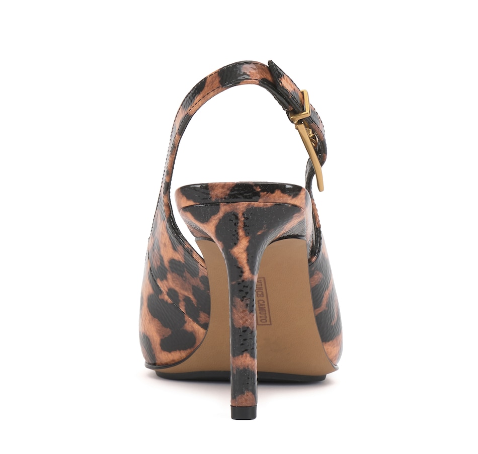 A rectangular buckle brings sculptural shine to this retro slingback pump from Vince Camuto. It is designed with a sharp pointy toe and softly squared topline.
