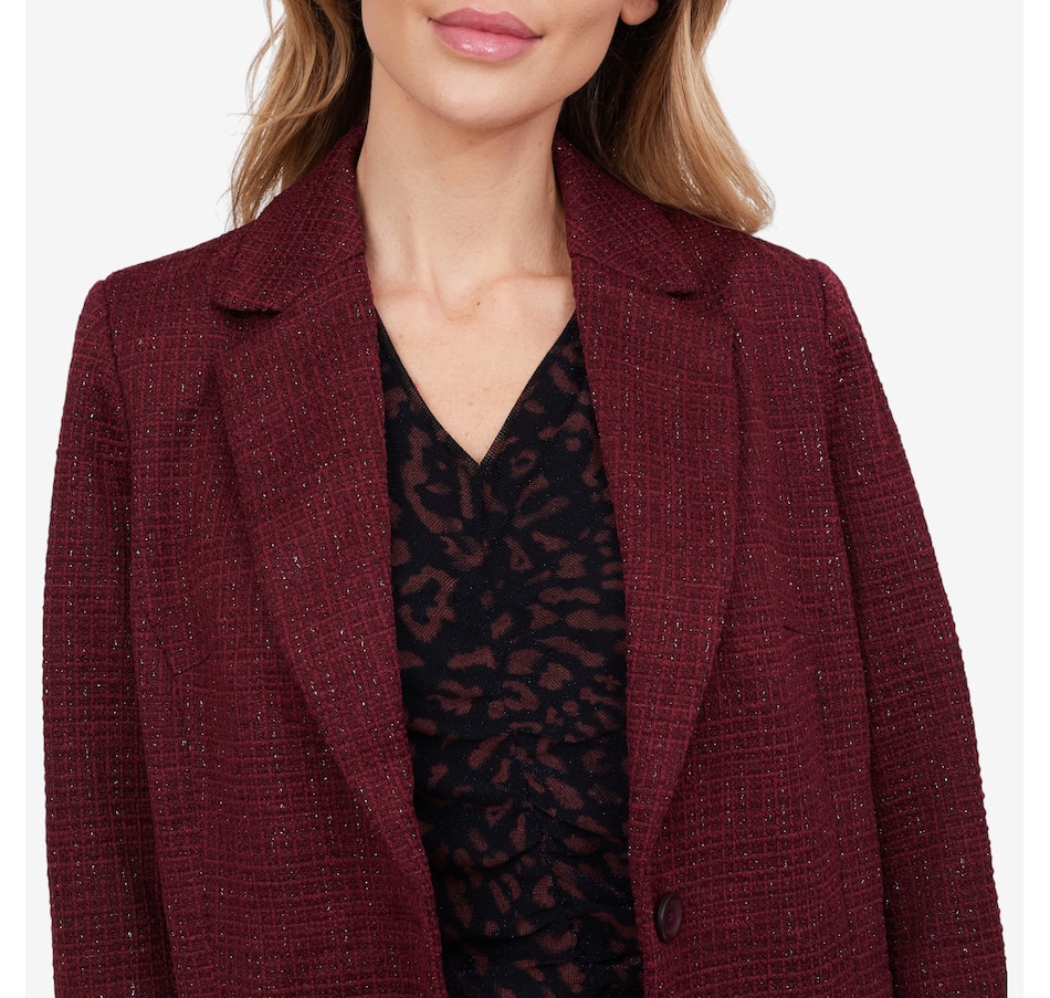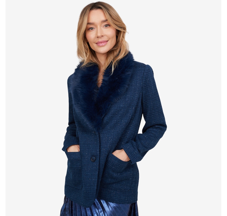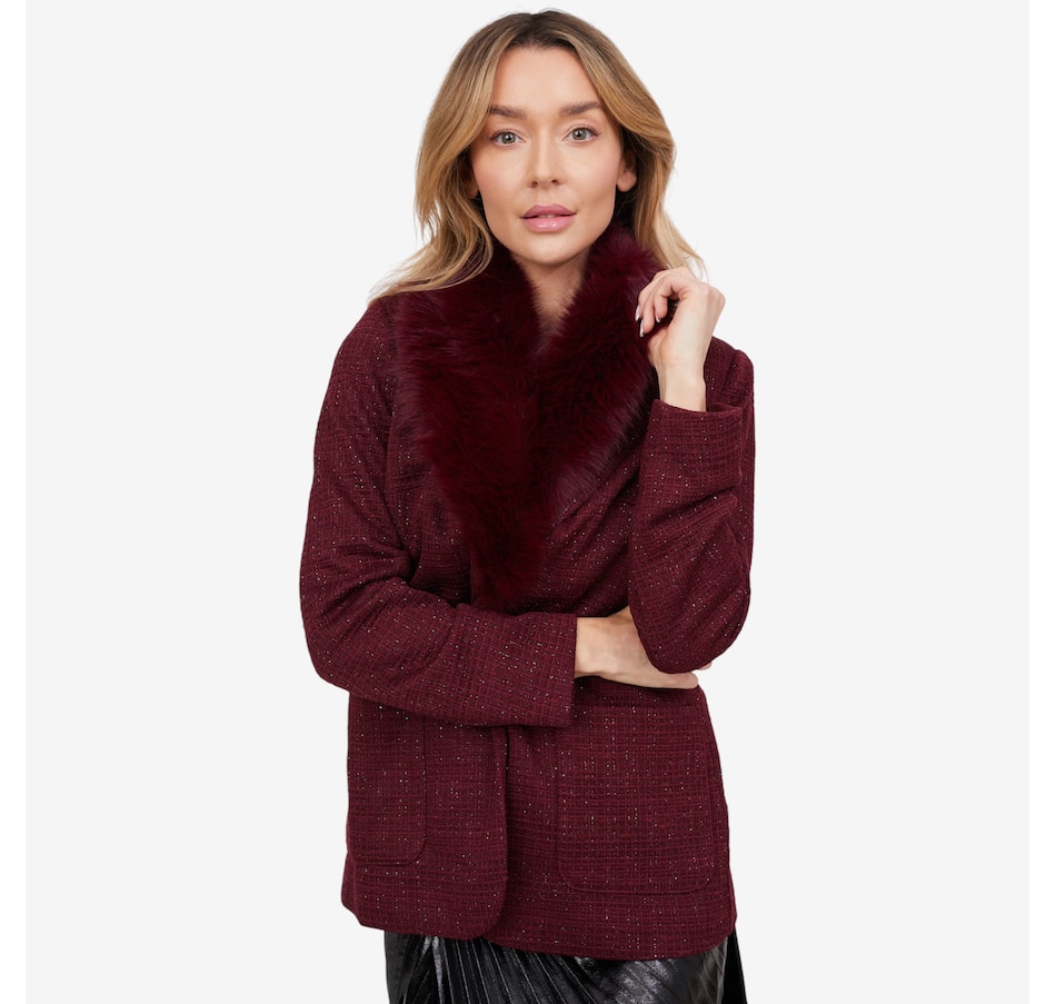 • Fabric: (self-knit boucle) 96%, polyester 3%, lurex 1% spandex; (lining-taffeta) 100% polyester; (detachable collar) 100% polyesterÂ