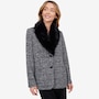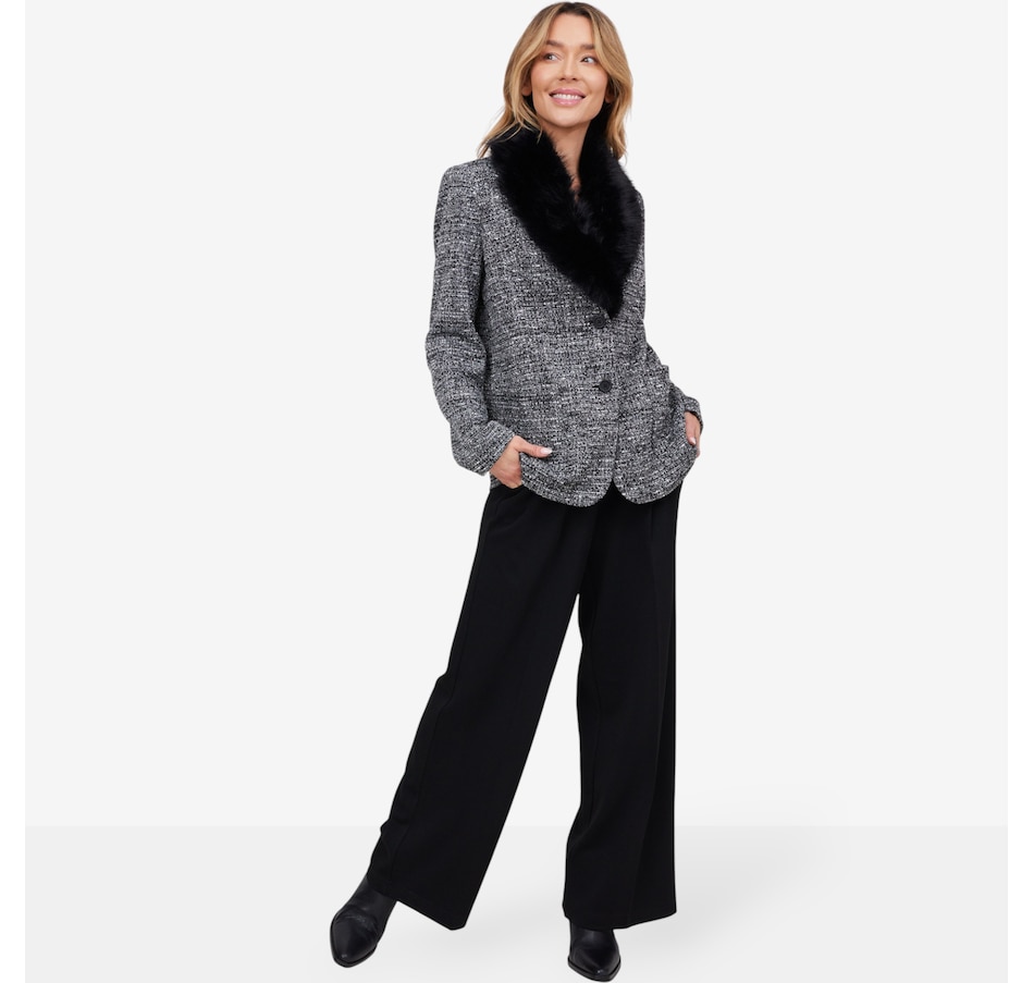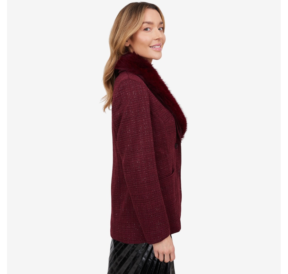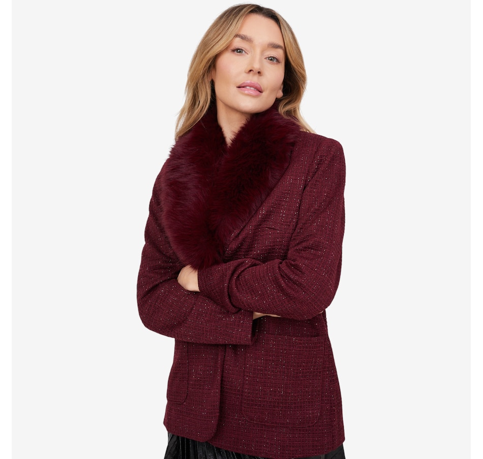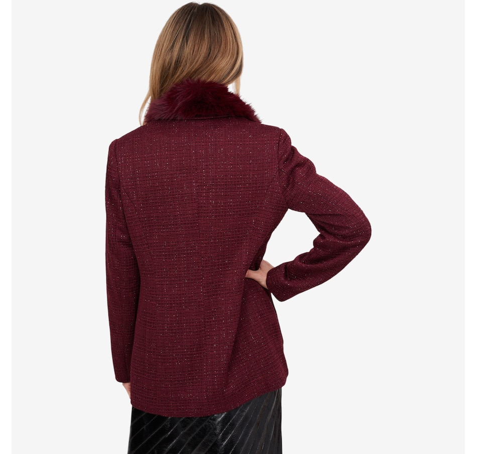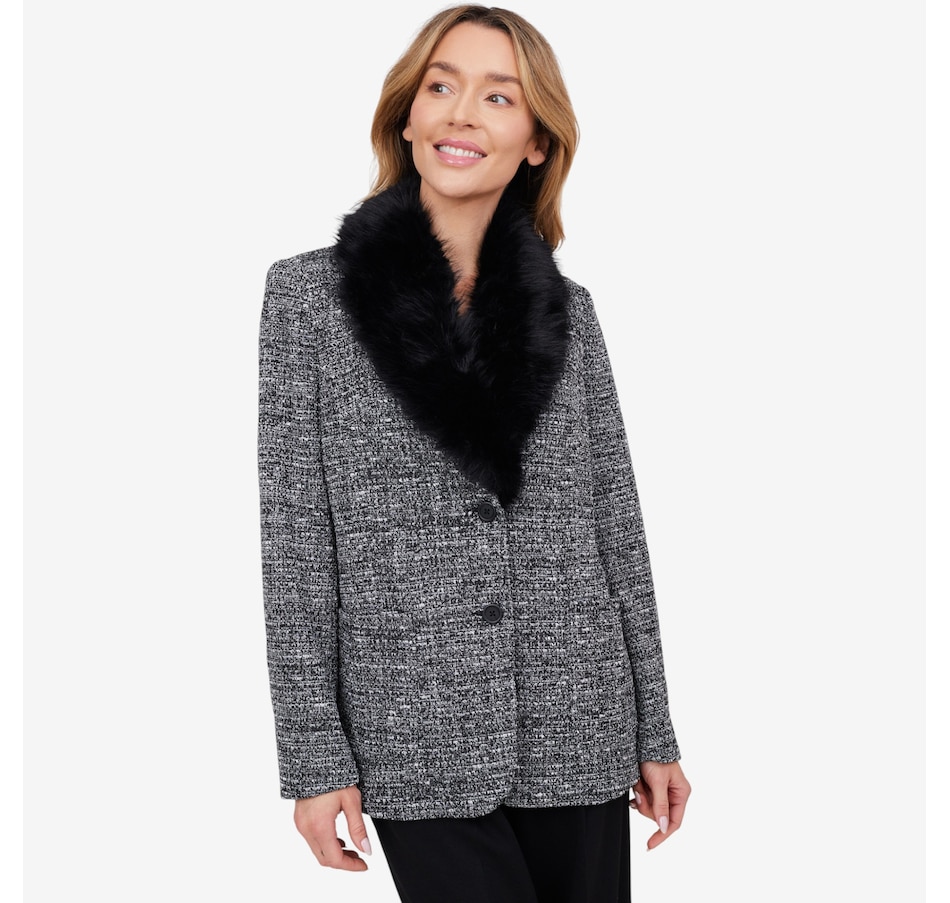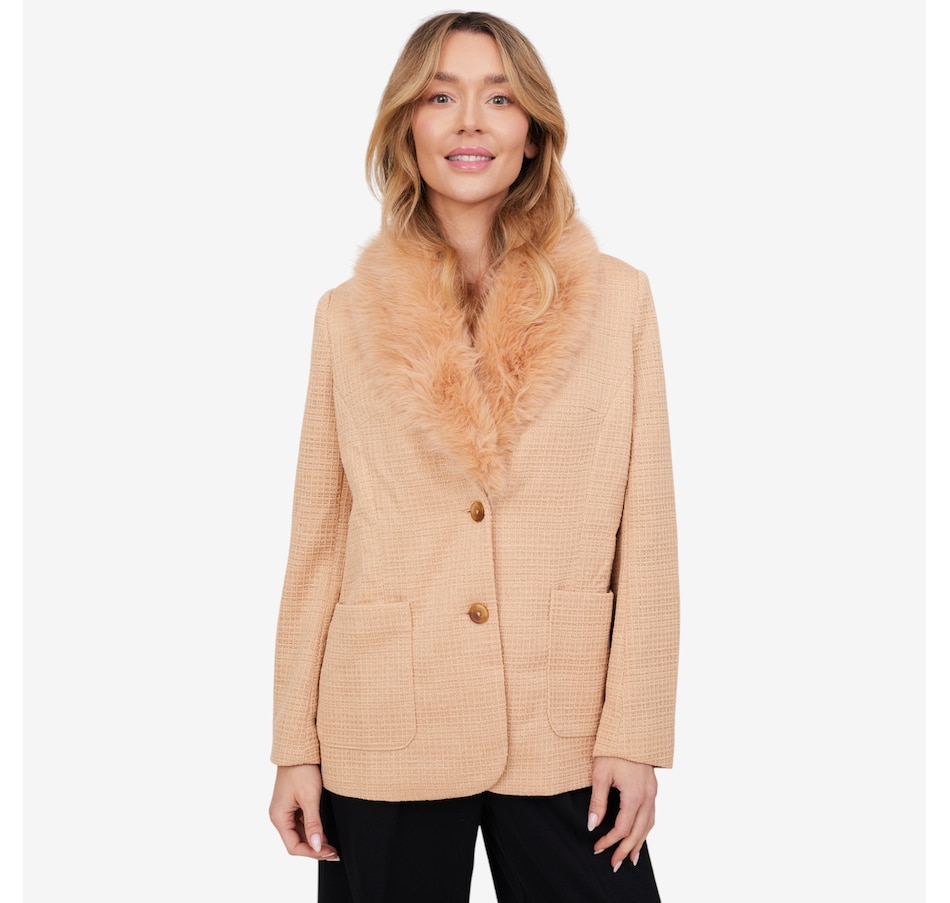 This is a fully tailored blazer with an inner construction of fusible and shoulder pads. It is constructed from a four-way stretch double knit tweed for great mobility and comfort. The blazer has a three-button closure with keyhole buttonholes and a detachable faux fur beaver collar.