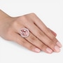 This ring showcases the striking beauty of a large faceted morganite framed by the refined sparkle of white diamonds in a bold halo design. The polished rose gold setting enhances the warm blush tones of the centre stone, creating an elegant and radiant cocktail look. Smoothly crafted with a comfortable profile, the piece brings luxurious presence and timeless sophistication to any jewellery collection.