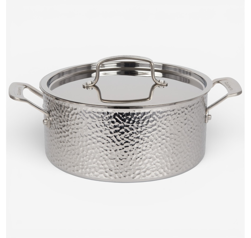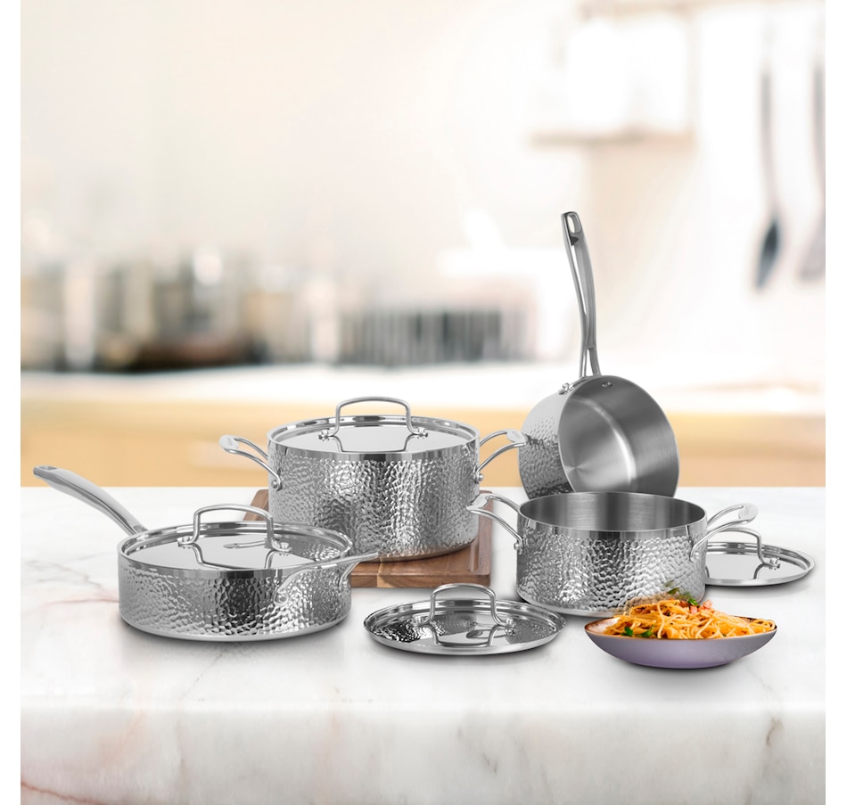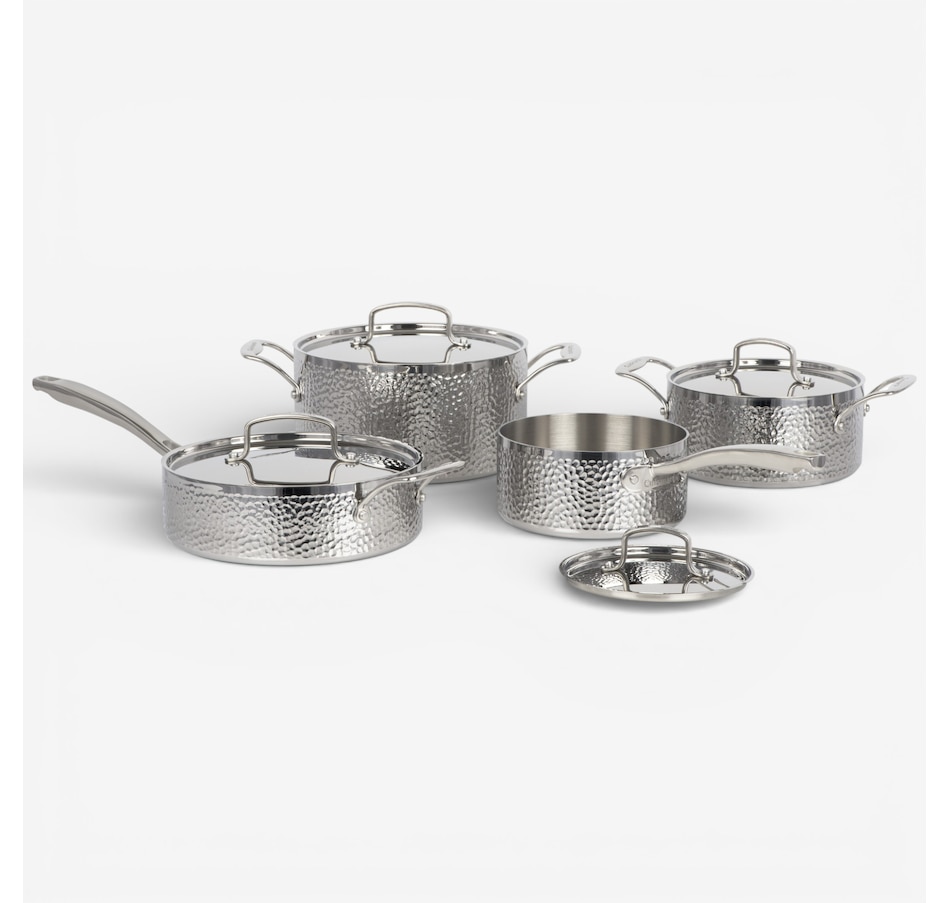Elevate your culinary experience with this Cuisinart eight-piece vintage hand hammered tri-ply cookware set. Crafted for both beauty and performance, this stunning collection combines timeless design with modern innovation. The traditional hammered stainless steel exterior exudes elegance, while the tri-ply construction with a pure aluminum core makes for exceptional heat conductivity and durability. Featuring Heat Surround Technology, each piece delivers consistent, even heat along the base and side walls for flawless results. The riveted cast stainless handles provide a secure, comfortable grip, and the stainless steel covers lock in flavour. Induction-ready and oven-safe up to 500°F (260°C), this set adapts to any cooking style, and cleanup is effortless with dishwasher-safe convenience! From delicate sauces to hearty casseroles, sautéed masterpieces to slow-simmered stews, this set is your ticket to professional-grade cooking at home!