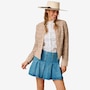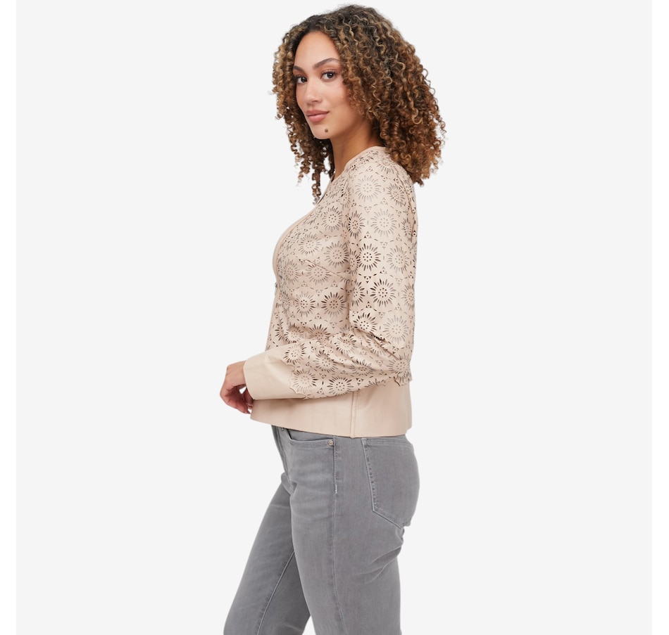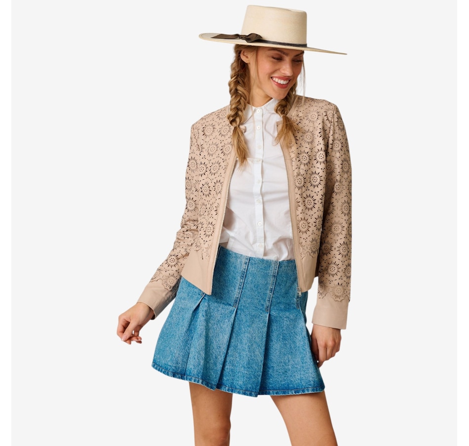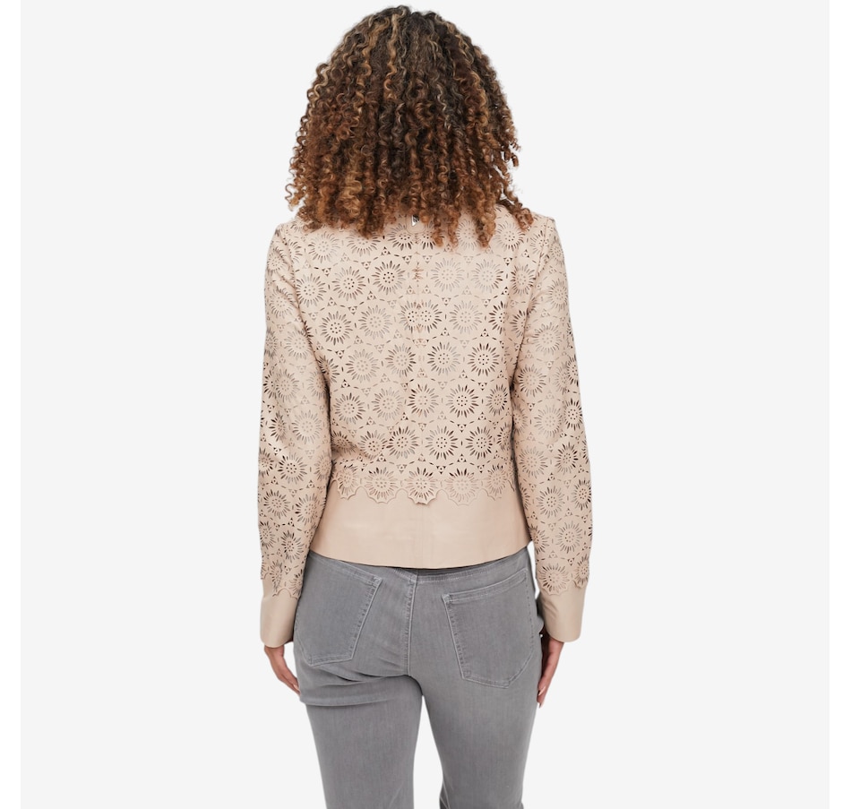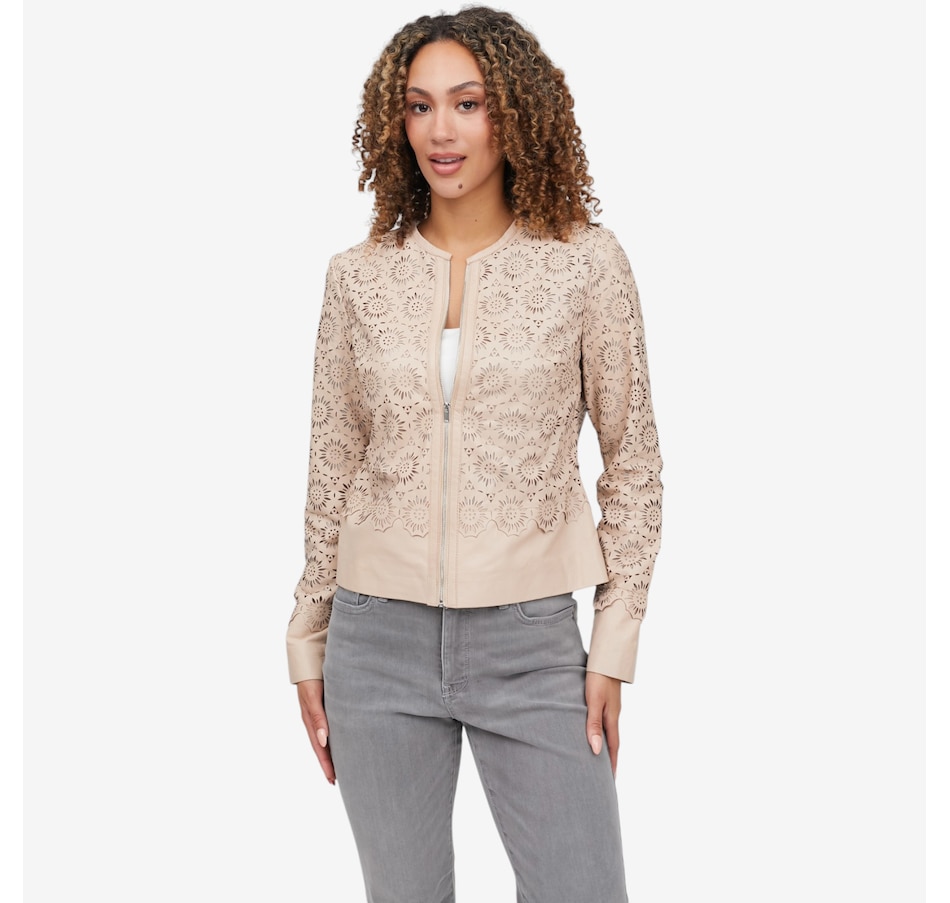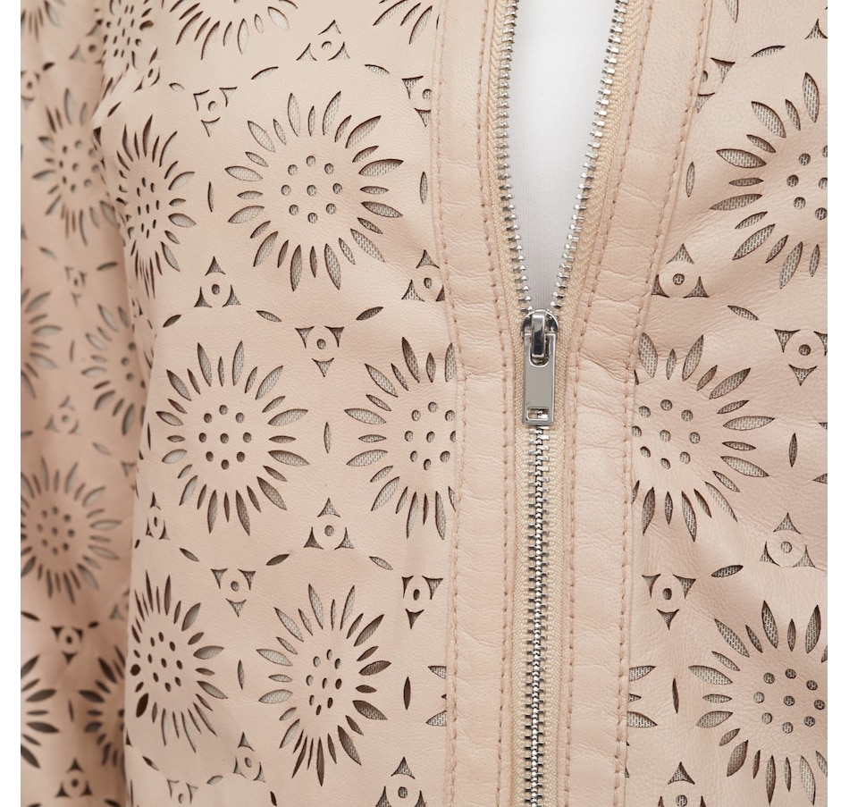 Step into lightweight luxury with the Mauritius Lacey leather jacket, a stunning statement piece crafted from exquisitely laser‑cut, perforated leather for an airy, breathable feel. Its unlined construction enhances the jacket’s soft drape, making it ideal for warm weather layering while still delivering the elevated edge of genuine leather. The clean round neckline and straight hem create a refined, minimalist silhouette, beautifully balanced by sleek zipper detailing for a modern finish.