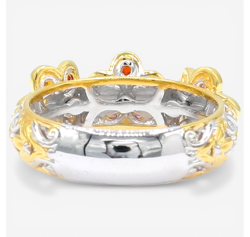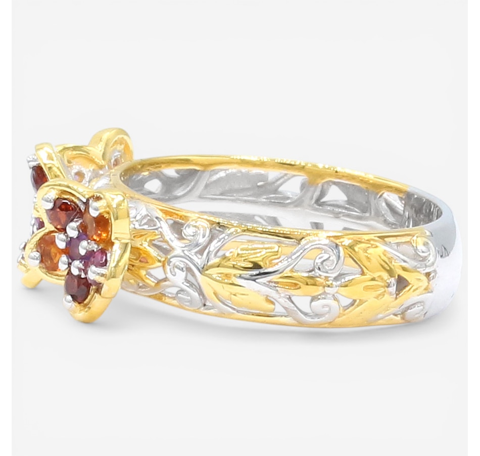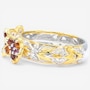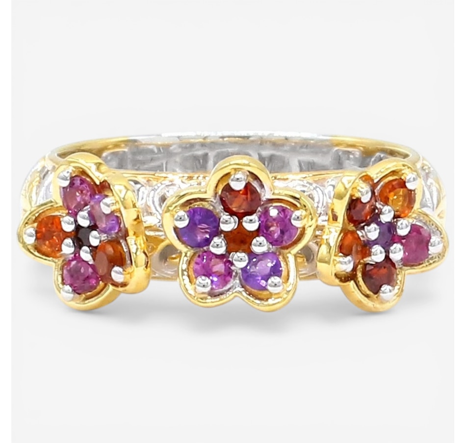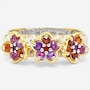 This delightful ring showcases a trio of blooming floral motifs brought to life with a vibrant mix of finely faceted gemstones. Citrine, garnet, rhodolite and amethyst come together in a lively display of colour that feels joyful yet refined. Polished and expressive, it’s a charming design that adds a fresh, nature‑inspired touch to any jewellery collection.