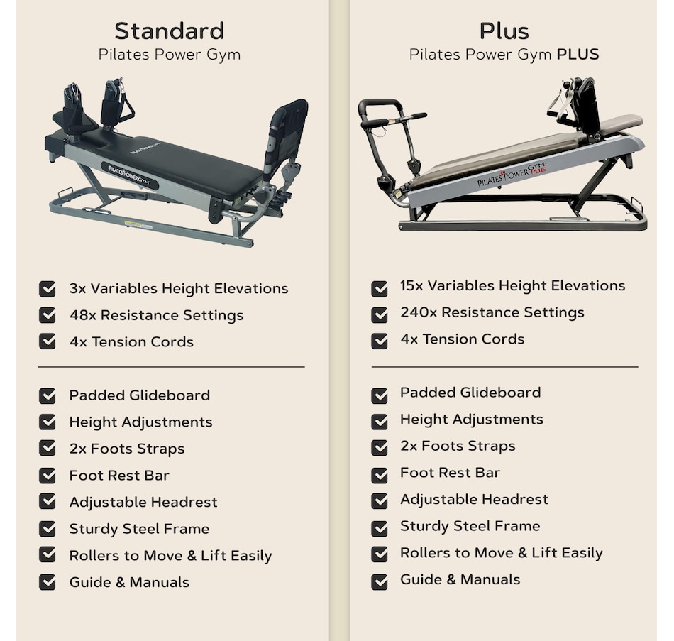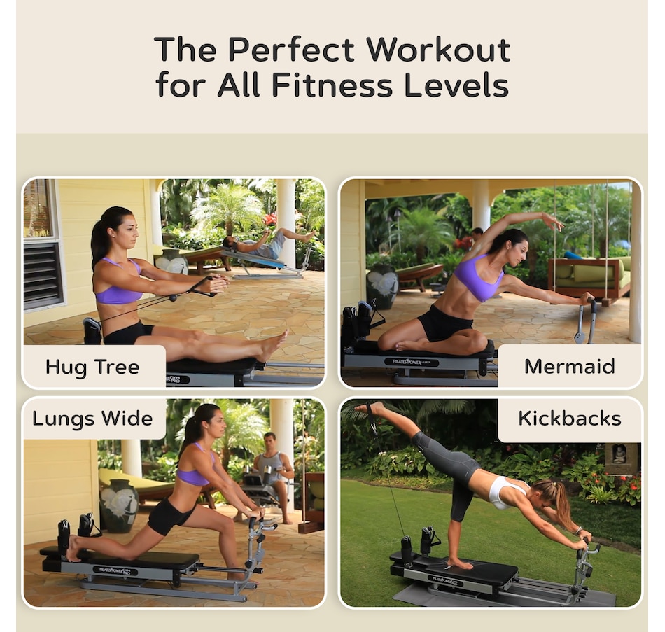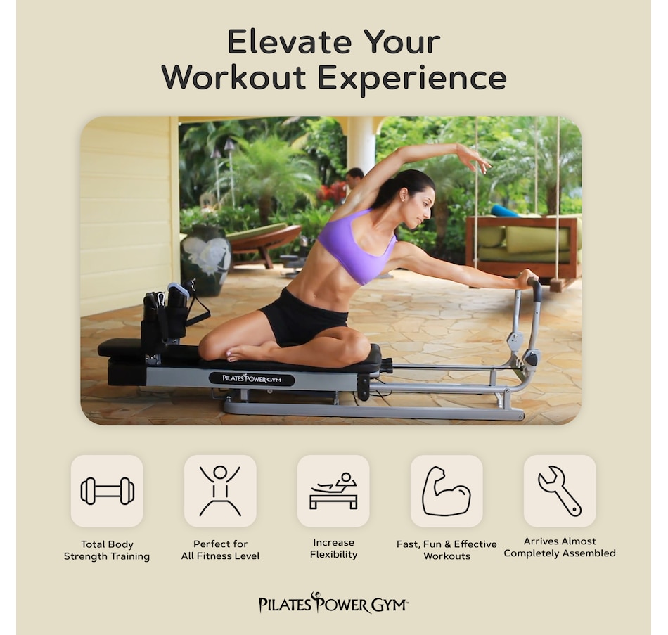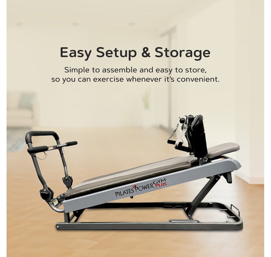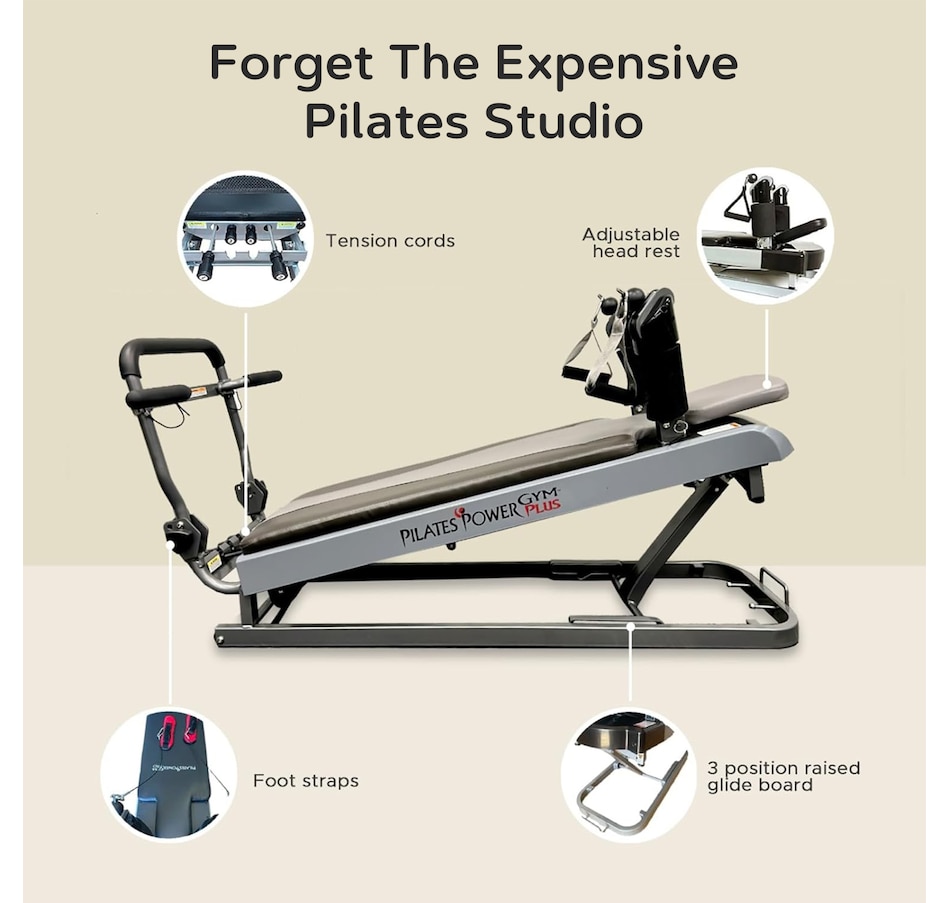 The Pilates Power Gym Plus features 15 variable height elevations and 240 resistance settings, and comes complete with four tension cords for total‑body strength training in your home. Helps improve core strength, flexibility and body toning.